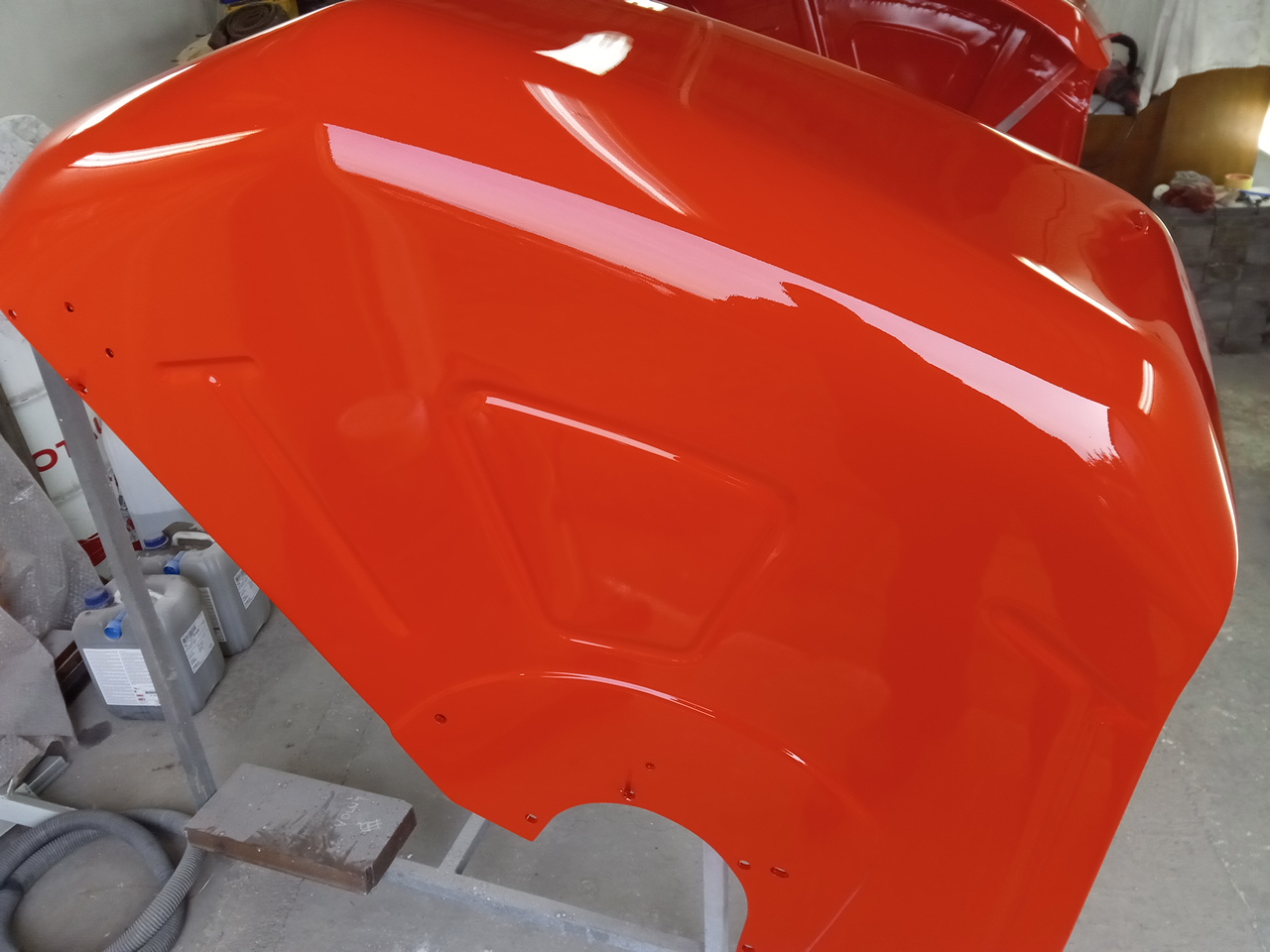 Nepředkládám to jako univerzální řešení, ale mě se osvědčilo dávat místo plniče a základové barvy rovnou na tmel jednošlichtovku. Také dvousložková PUR barva, ale napatlám jí tam poměrně hodně štětcem a pak to přebrousím plátnem 400 až 800, pod vodou. Vylezou ven důlky nebo drobné nedokonalosti, tak ty menší zamáznu ještě barvou, a ty větší ještě tmelem a to místo přejedu jednošlichovkou. Když to mám, pak dávám svrchní 2K PUR barvu, tu vysoce lesklou. Dělám to proto, protože doma nemám zázemí na stříkání, a také protože jsem jednou zkazil nákup a tu jednošlichovku mám doma. Ale funguje jako podklad skvěle, a dobře se brousí.