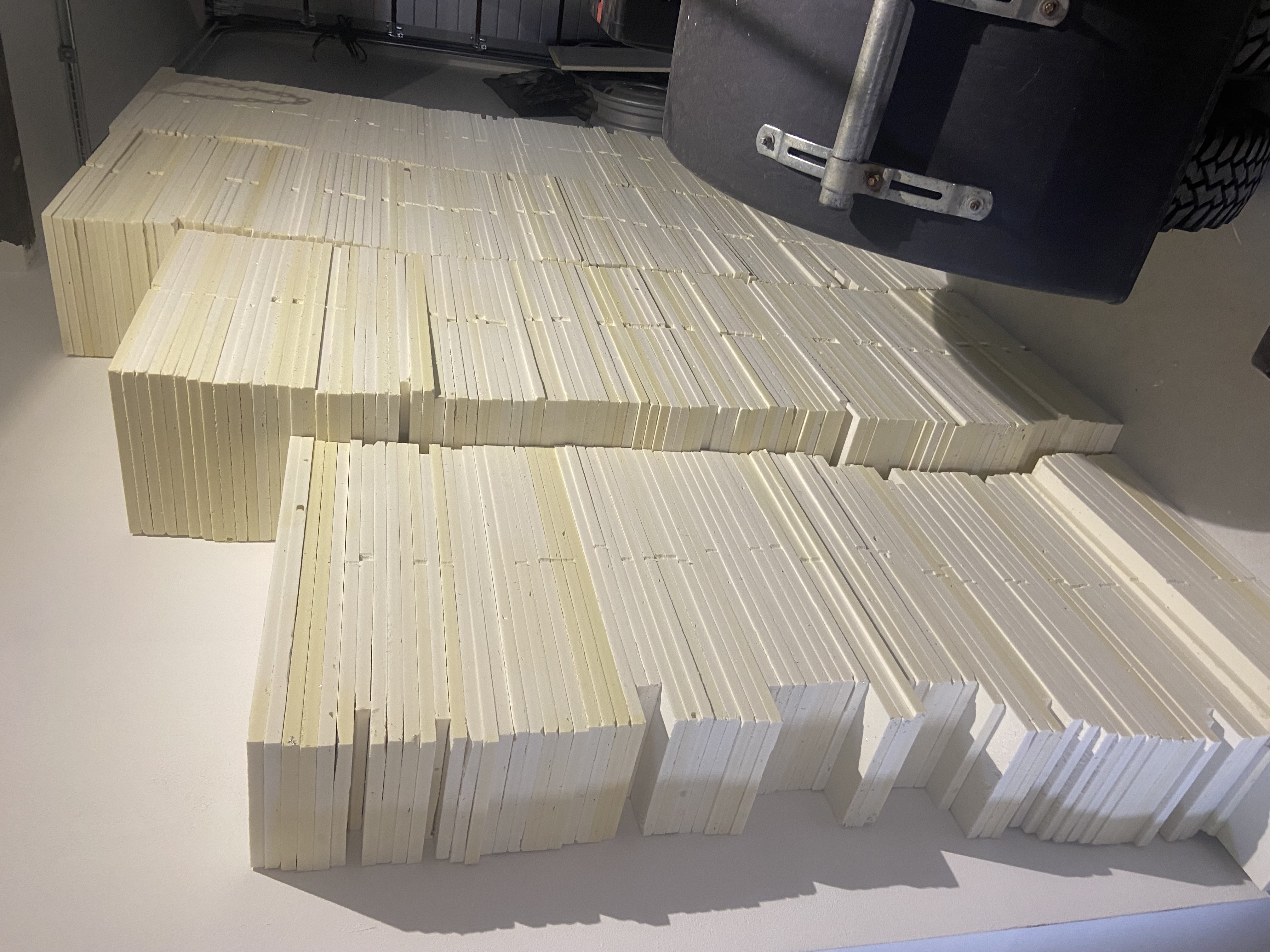 Aktuálně cca 2,5m3 , 5 různých opakujících se rozměrů. cca 350x700x20.