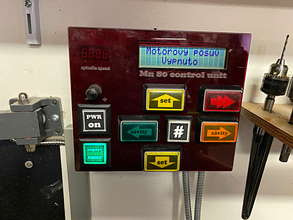 V mechanice soustruhu jsou už nevratné změny, otáčky snímám IRC Omron s výstupy A, B, Z. Nepoužívám klávesnici, protože mě to nějak neuspokojovalo, místo toho mám přednastavené stoupání od 0,5mm do 1,75mm vč. palcových. Na takový malý soustruh je i 1,5mm do železa hodně. Tlačítka jsou velká a fakt pro HEAVY DUTY použití a jejich podsvícení se interaktivně mění. Stoupání šroubu je odvozené přímo od otáček vřetena a jediným omezením je dodržení alespoň nějakých smysluplných řezných podmínek. Samostatnou funkcí je prostý posuv suportu v reálném čase nastavitelný potenciometrem. Samozřejmostí je elektronický doraz a akustická informace. Vůbec jsem neuvažoval o motorizaci suportu, protože klička je výrazně lepší nez jog.