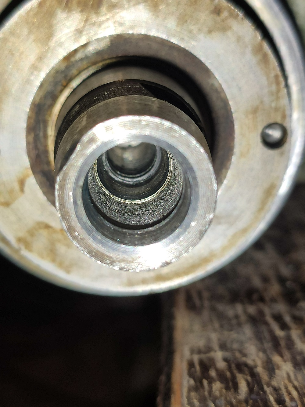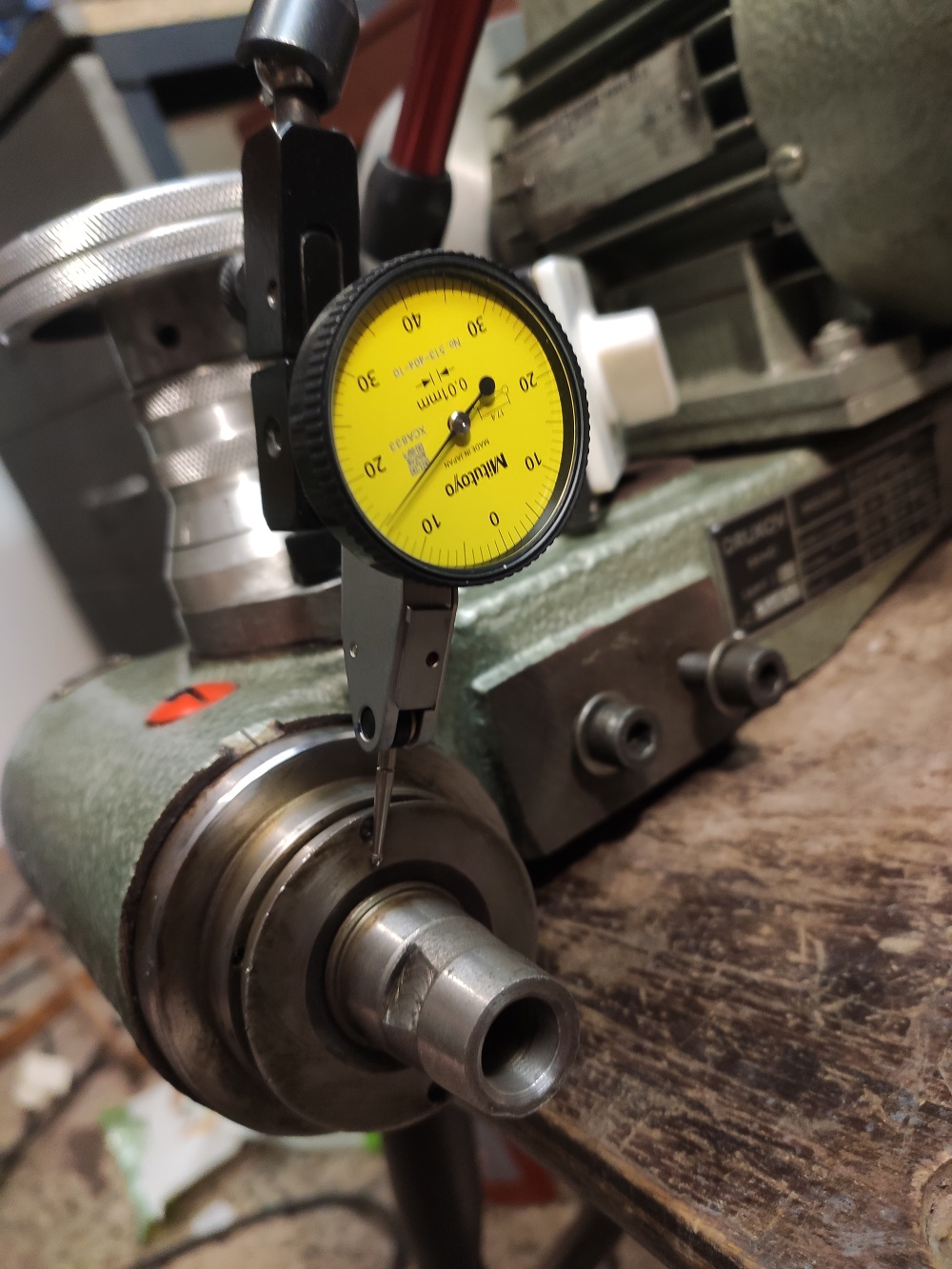 koupil jsem na první pohled skoro nepoužitou suportovou brusku SBMT-2. Ovšem po upnutí trnů na vnitřní broušení jsem zjistil, že ty na konci házejí o 1 mm. Vnitřní a vnější kužele pro upínání nástrojů/kotoučů házejí něco kolem 3 až 5 stovek, dosedací plocha na vřetenu 15 stovek a druhý konec vřetene s řemenicí 2 stovky. Radiální vůle v ložiskách do stovky měřeno na konci vřetene "přiměřenou silou". Vřeteno jde hladce. Bavíme se o tom krátkém vřetenu, dlouhé jsem ještě neměřil.