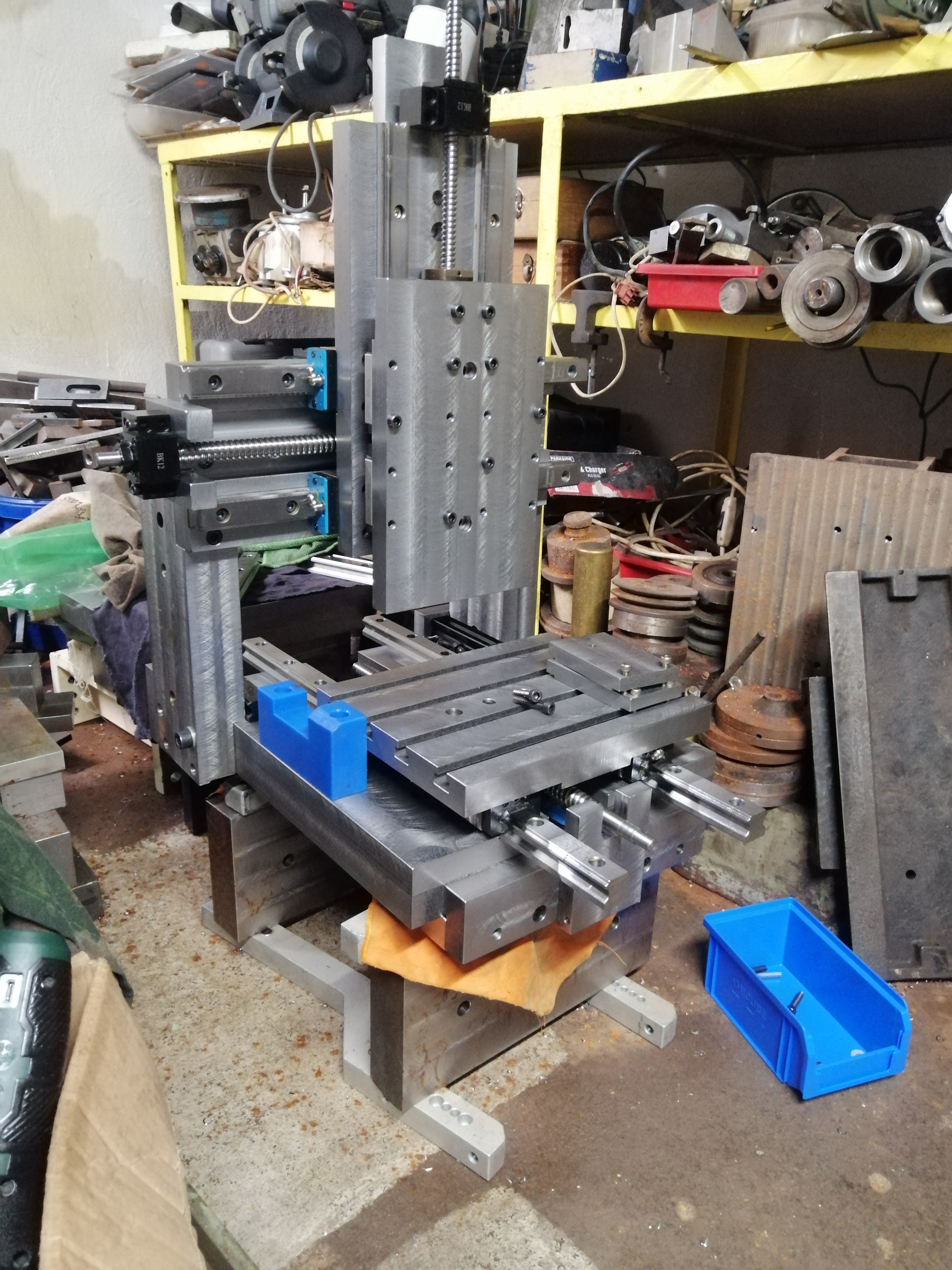 Celá konštrukcia srobovana, frezovana... Základňa z dvoch oceľových plechov:120x430x50mm nasrobovane na plech 300 x 420 x 30 do tej základné za frézovanie drážky 3mm na koľajnice pre y os, brana je z plechu 400 x 150 x 35mm,zafrezovane drážky pre os X, stojky brány sú plné profily 110x 370 x 50,vsetko ofrezovane, urobene drážky, zaseky pre presne umiestnenie a sosrobovane imbusovymi pevnostnymi srobamy M10,..