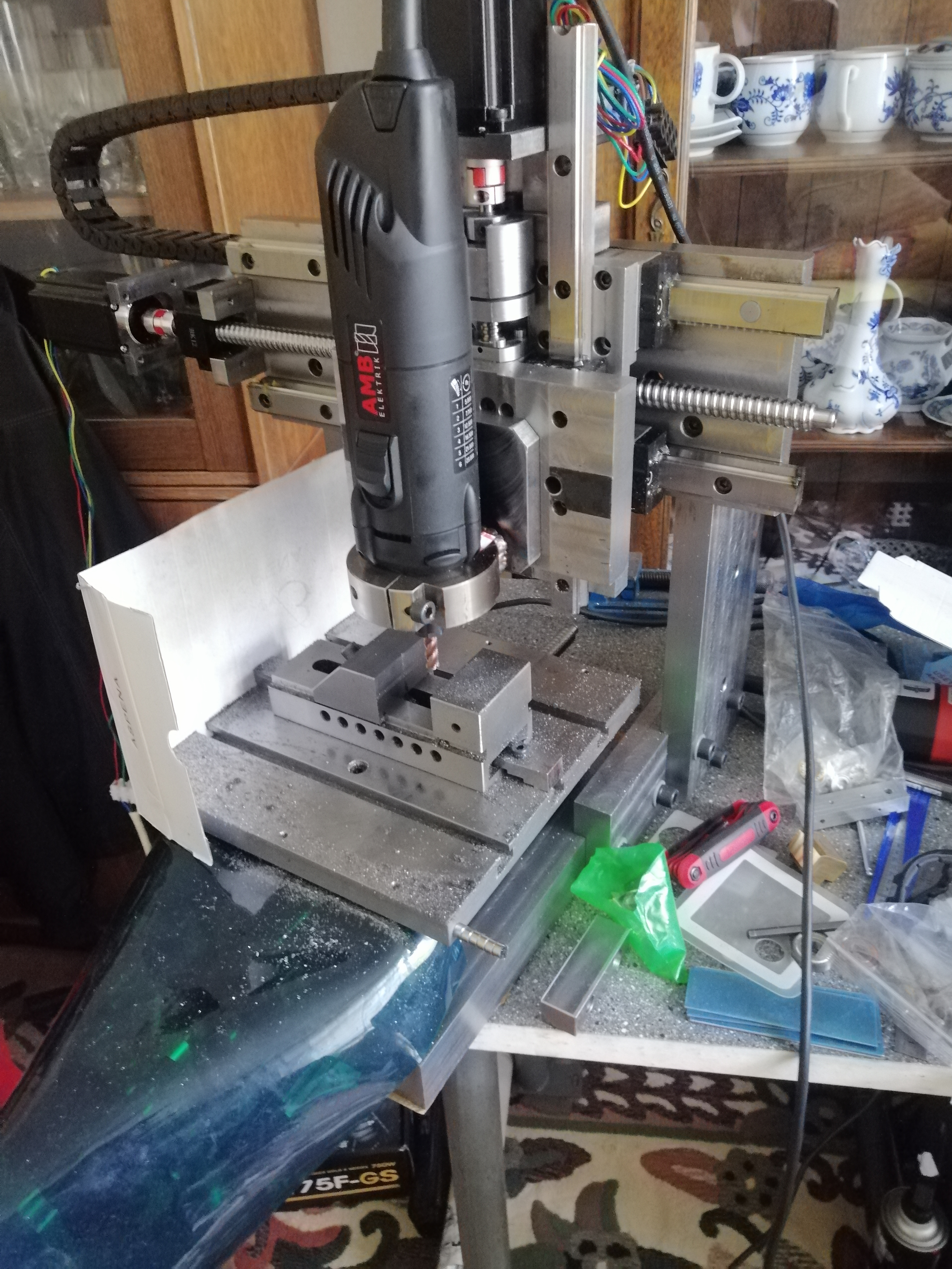 Vreteno ešte neviem aké... Prvú mašinu co som urobil som použil AMB 1050 vreteno, ale to sa mi aj na ten môj prvý strojček zdá slabé... Prvá mašinka je tiež celá z ocele, asi 100kg,obrábacie plocha 200x200,len z je slabé, lebo je len 80 mm... Hliník zere celkom slušne... Ale myslím ze tuhosť konštrukcie a celkovo je najslabším článkom vreteno.. :(