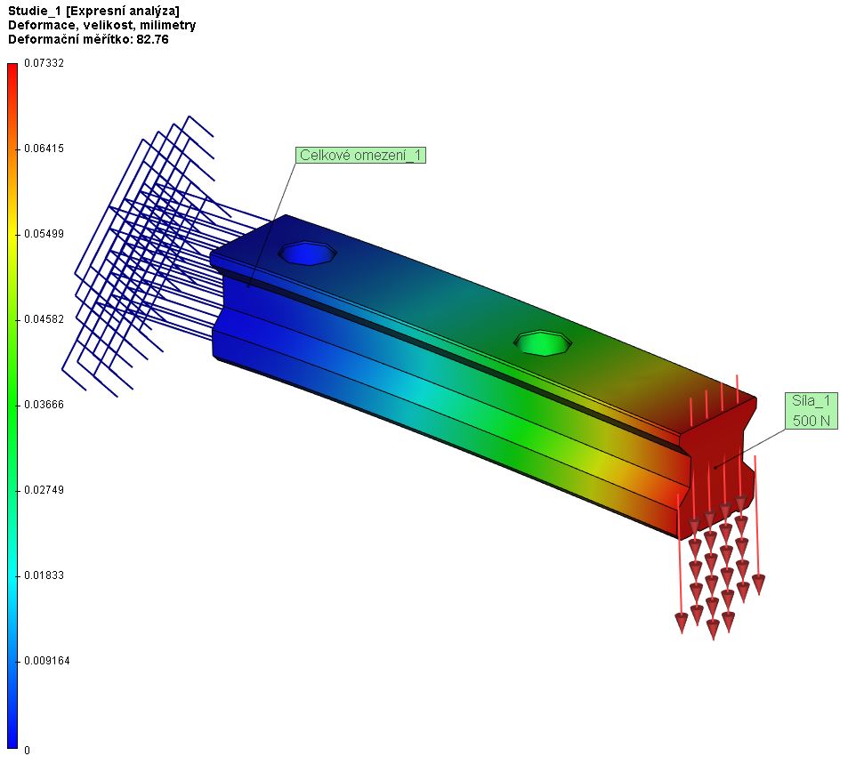 Jako máš to lineární vedení docela slušně naddimenzovaný, ale přeci jenom bych ho podepřel. Lineární vedení má přenášet síly do rámu, ne být jako samotný nosný prvek. To lineární vedení je docela zeslabené dírami pro šrouby, ohyb nemusí být zanedbatelný vzhledem k životnosti vozíků a k výsledné přesnosti stroje. Záleží, jak to zatížíš.