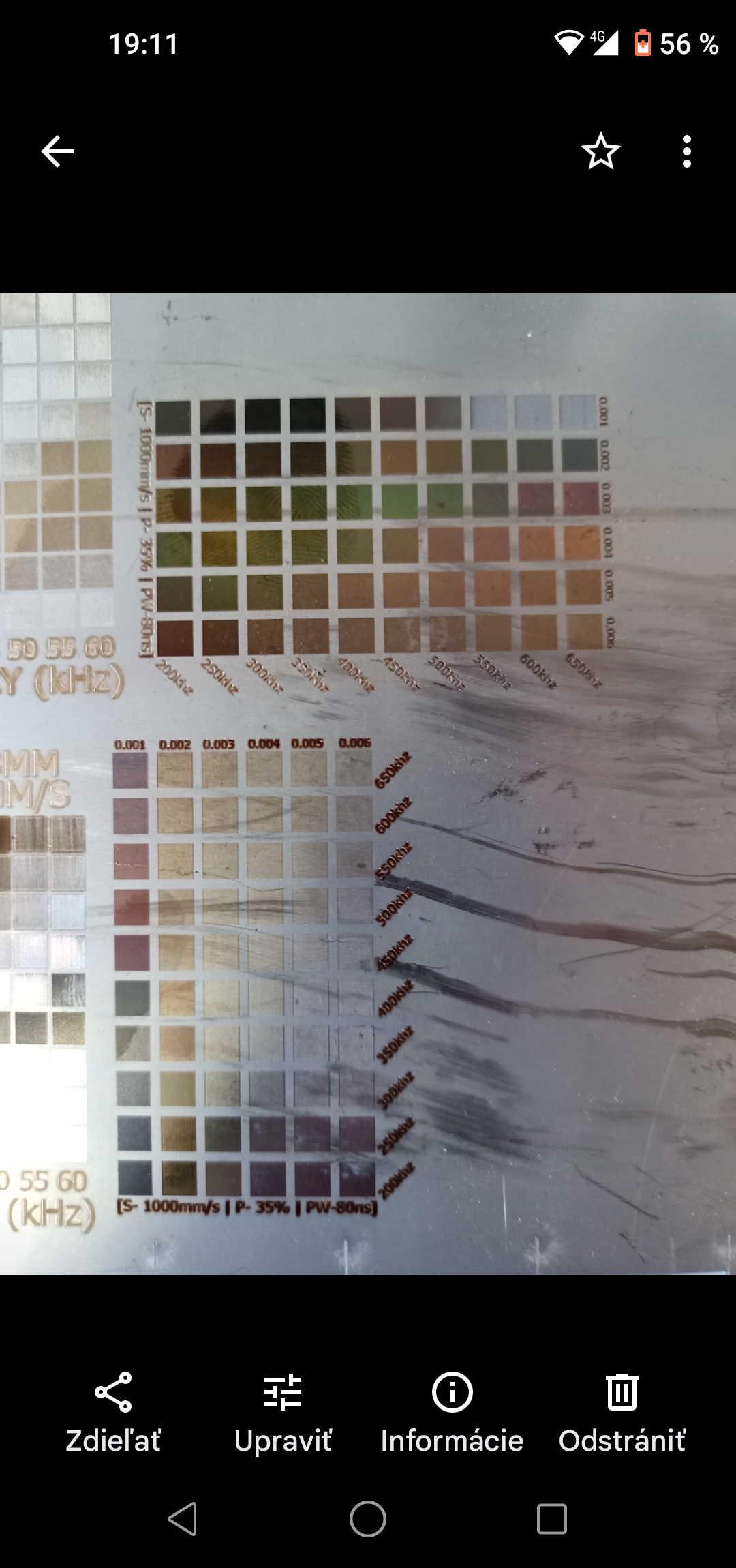 Na finálny výsledok ešte vplýva vzdialenosť prejazdov (line distance) a z časti aj stratégia "obrábania". Tu sú napríklad dve vzorkovnice, u oboch rýchlosť 1000mm/s, sila 35% a 50%, Q pulse 80ns, stratégia riadkovanie obojstranné, a premenné boli vzdialenosti a frekvencia.