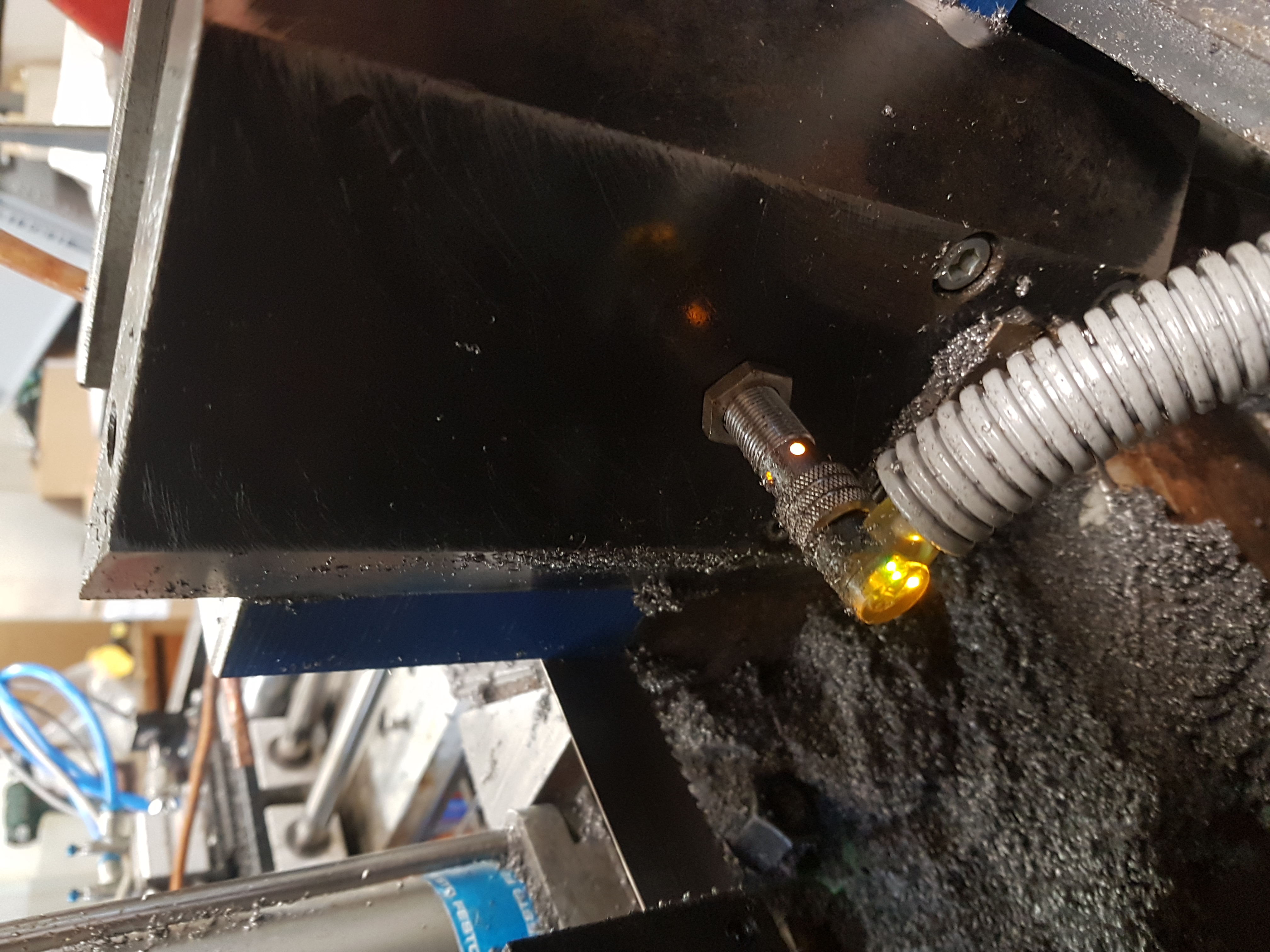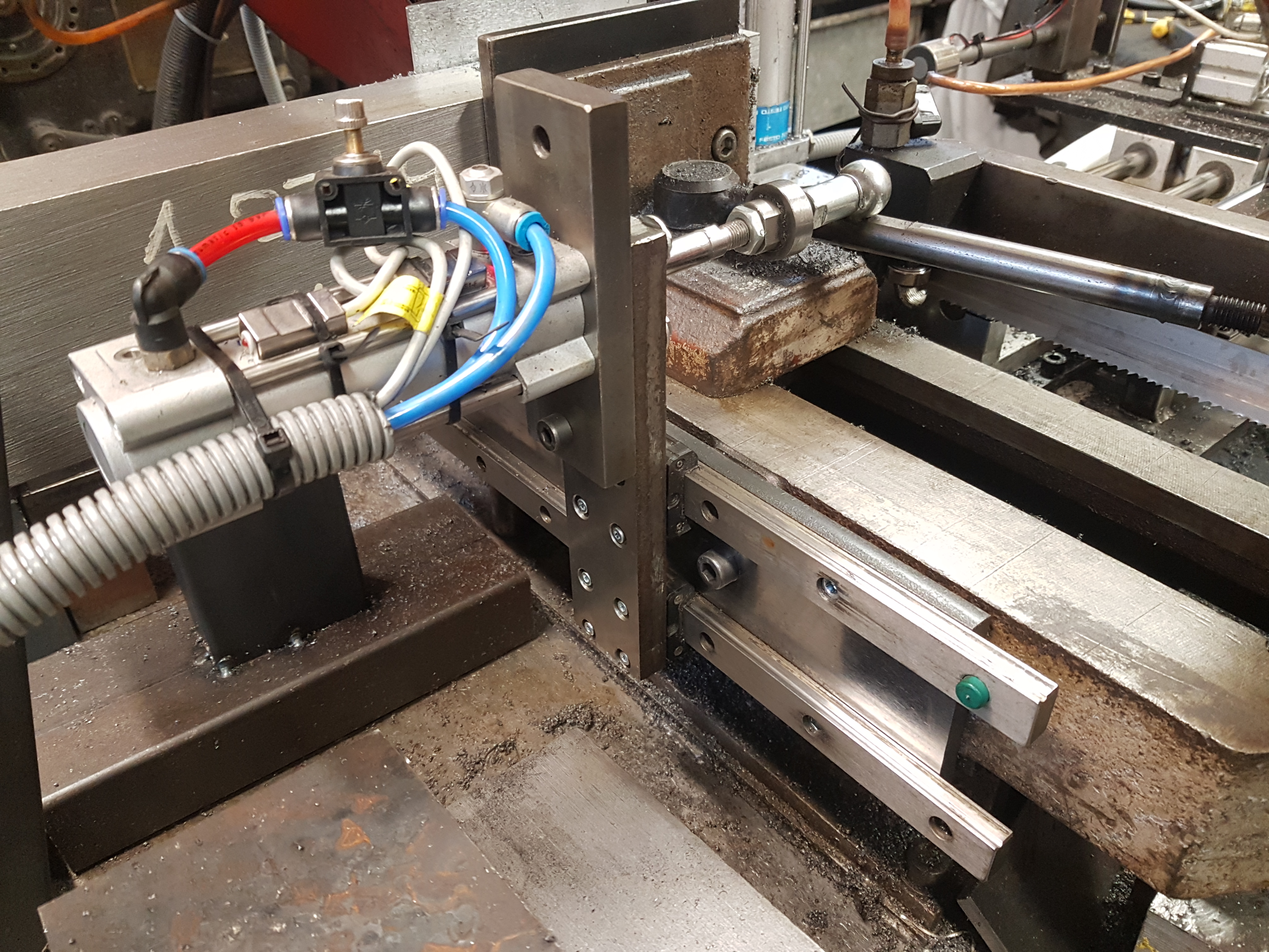 tady je pouhý modul který je na 2 šroubech, sverák který je na lin. vedení pro možnost řezání jiných rozmerů a čidlo které hlídá konec bloku. To mohu ješte posunout nebyl jsem si jist jak moc malý blok to udrží aby se nezvrtnul nebo nezačalo podřezavat.... :-)
