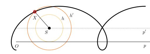 Nebo v terminech deskriptivni ci konstruktivni geometrie - prodlouzena cykloida. Pevna polodie je primka (kolej), hybna polodie je kruznice (kolo na odvalovanem prumeru) , pricemz kotalejici se teleso obsahuje i body vne teto kruznice.