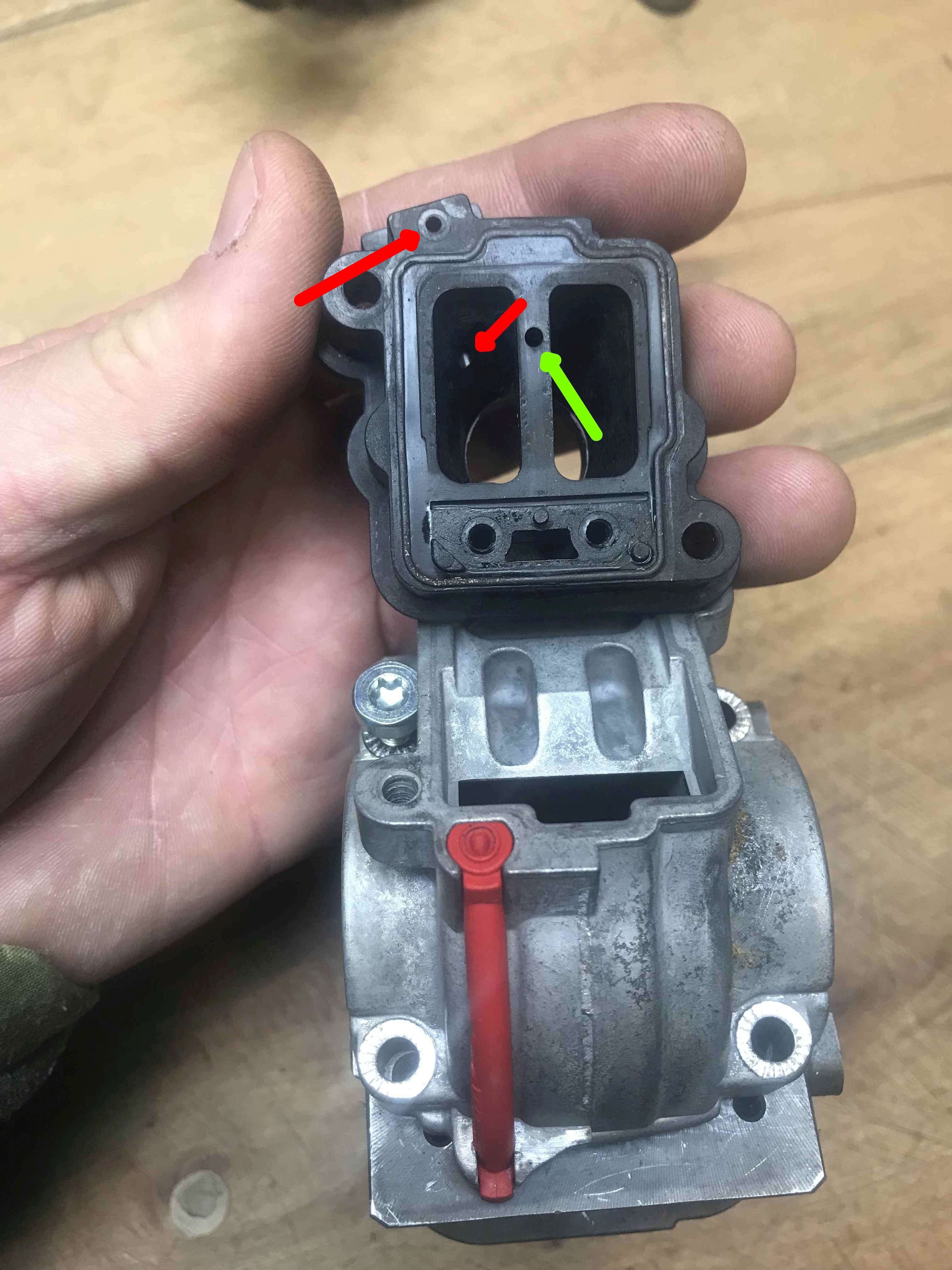 Ešte aby to bolo zaujímavejšie tak v telese klapiek kam hadička ústi(dierka so črvenou šípkou) je jednosmerný ventil - otvorený smerom von z kľukovky.