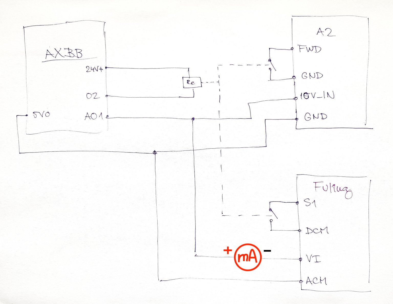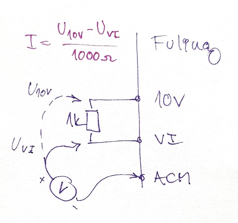 Napadlo mě jednoduché řešení, odpoj AXBB dráty z VI a radši i ACM, nech tam jen ten 1k odpor a změř napětí na 10V svorce a VI svorce proti ACM, z toho se proud dá snadno spočítat (a ověřit, že se vstup VI chová jak by měl = odpověď lubbezovi).