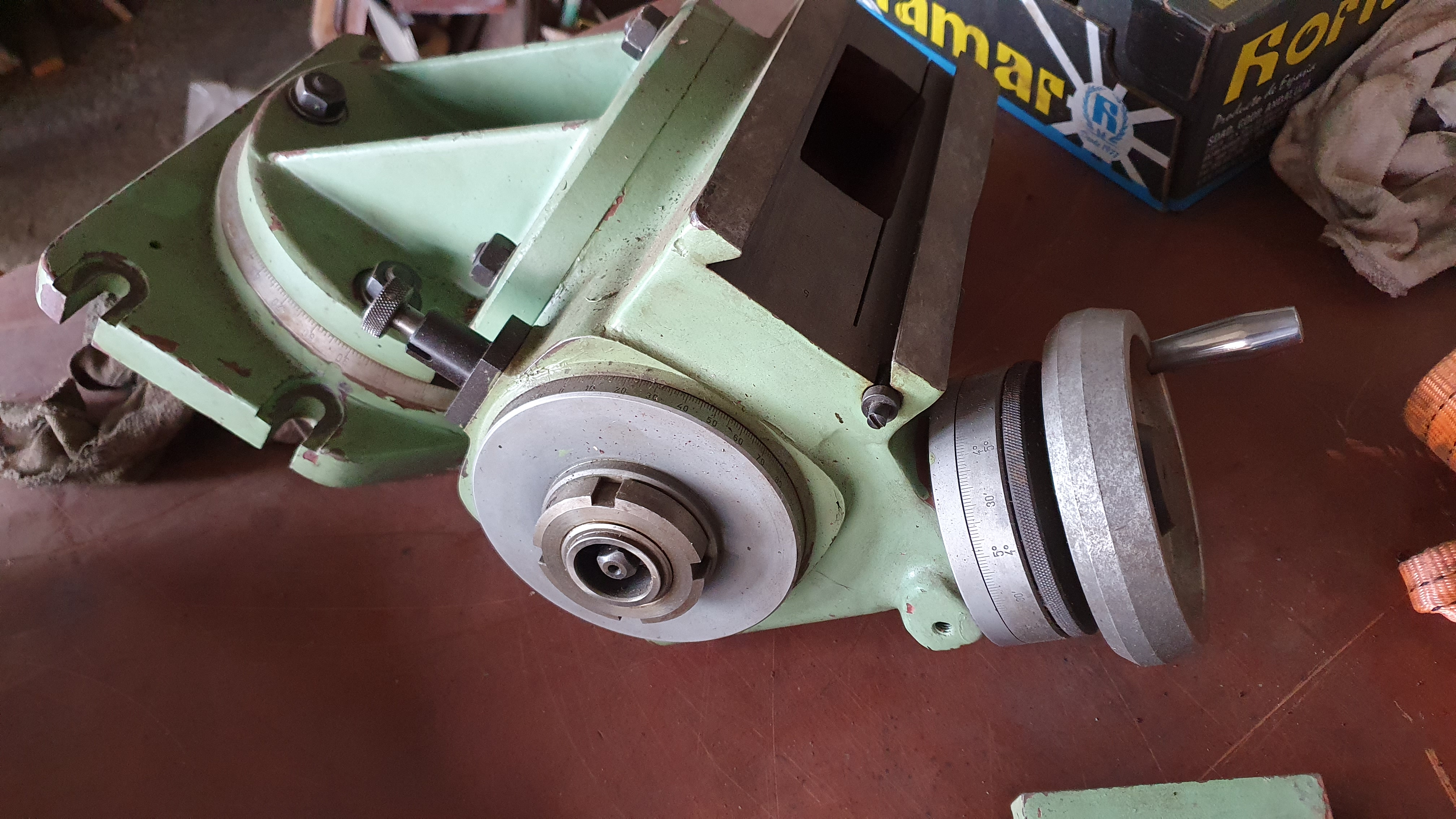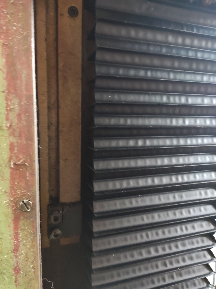 Je to trámec vyfocený vzhůru nohama. Nahoře je cca 30 cm dlouhý hřídel na třech ložiskách s jedním velkým posuvným kolem (pouští nebo se jím vyřazuje náhon vřetene) a jedním malým kolem (které bylo na peru nejvíce volné a právě pod ním je hřídel docela poškozená). Tohle malé kolo pohání asi úplně stejné malé kolo schované uvnitř trámce (pozornější čtenář si tohoto kola povšimne na druhé fotce :)), které je na 50 cm dlouhé hřídeli. Ten je na 2 ložiskách a čouhá pak ven z trámce - nasazují se tam na něj frézovací hlavy. Ta část, co čouhá, má na části obvodu vychozenou drážku.