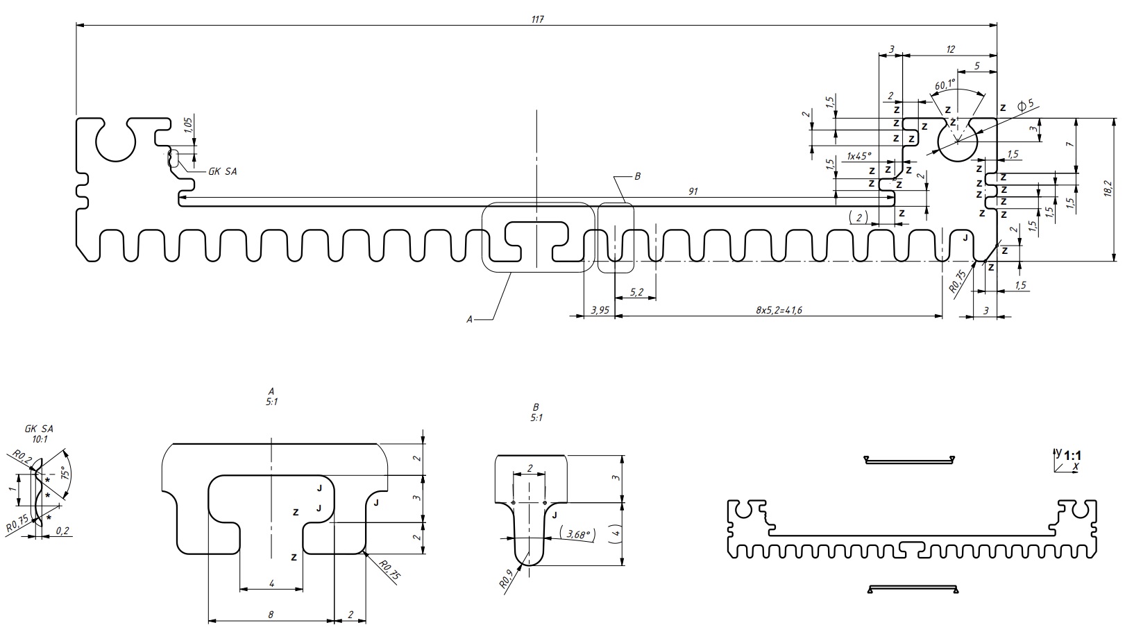 Profil je z obou stran otevřený, takže jej potřebujeme uzavřít. Naše představa, kterou poptáváme, je že by se například do plastové desky (může být i jiný materiál, možná tenčí hliníková deska?) o tloušťce 6 mm vyřezal tvar profilu, s tím že část, která by kopírovala plnou část hliníkového profilu by měla 2 mm a zbytek vyřezané plastové koncovky by měl tloušťku 6 mm. Plastovou koncovku bychom tedy "zaklepli" do hliníkového profilu a ještě bychom ji z vnitřní strany připevnili k profilu lepidle/silikonem.