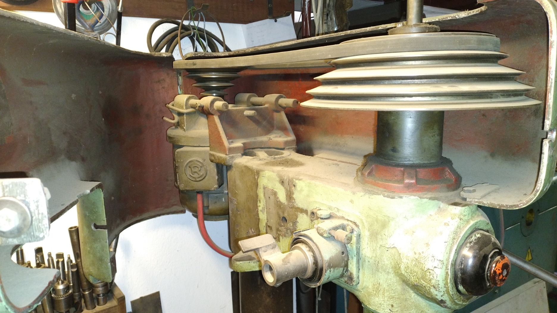 mám bytelnou sloupovou vrtačku a nemá žádný štítek. Podle provedení se to podobá na nějaký výrobek Jihokov, ale nikde jsem to nedohledal. Celkové foto zatím nemám, je zastavěná všeličím v rámci momentálních přesunů v dílně. Vrtačka má docela nezvyklé řešení převodu posuvu pinoly, když se hřídel s pákou povytáhne, tak se změní převod mezi ruční pákou a pinolou a pinola klesá pomaleji a s větší silou. Potkal jste se tím už někdo? Než ji pošlu do světa, tak bych docela rád věděl, co to mám za typ:-)