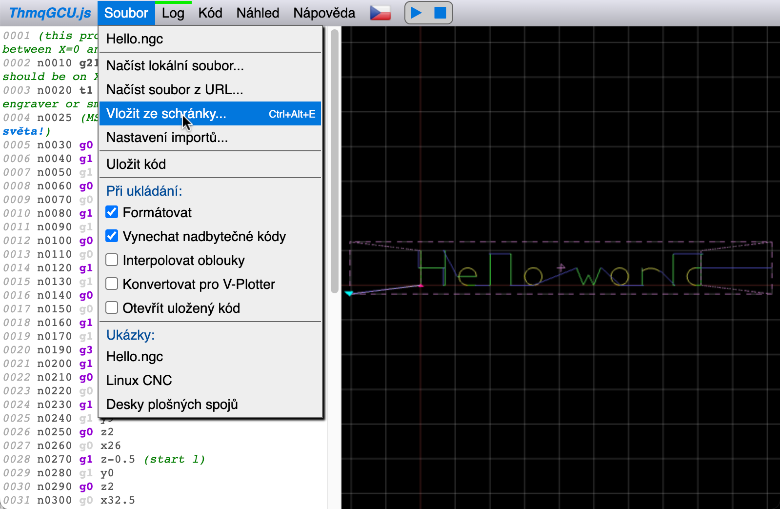 Děkuju za pochvalu! :) Máš pravdu, panel s kódem je určený čistě pro čtení. Jednoduchá editace je možná v dialogu pro vkládání kódu ze schránky. Ten má i funkci pro načtení aktuálně načteného kódu. Takže načteš gcode, otevřeš si tento dialog (jde to i klávesovou zkratkou Ctrl+Alt+E), v něm zmáčkneš tlačítko "Načíst aktuální kód". To naplní jak editační panel tak i políčko pro jméno souboru. Změny lze potvrdit tlačítkem OK nebo klávesovou zkratkou Ctrl+Enter. Nic moc, ale na jednoduchý kód se to použít dá.