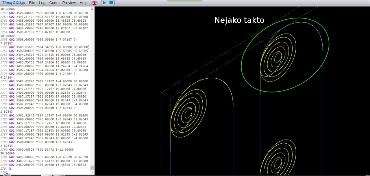 Nedá mi nepochváliť Tvoj počin, je to podľa mňa parádna pomôcka, keď som niekde mimo domácich podmienok a potrebujem si pozrieť nc kód. Mám len takú malú poznámku. Nebolo by možné zvoliť nejaký mód zobrazenia s nastavením farieb podľa rýchlosti posuvu? Napr. mám spravený výjazd zo záberu po kružnici, ale už vyšším posuvom, ako obrábanie, a celkom by mi pomohlo, ak by sa dala vizuálne skontrolovať zmena rýchlosti posuvu.