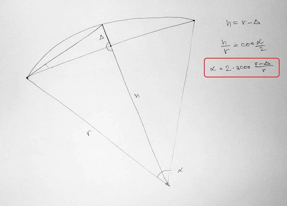 Tj. maximální povolenou odchylku převedu na maximální možný úhel segmentu pro daný rádius (finální krok je ještě přepočtený tak, aby byl stejný pro všechny segmenty a to tak, aby byl vždy buď menší nebo stejný). Snad v cajku. Souřadnice jdou zatím do výstupu s přesností na hodně desetinných míst nezávisle na zvolené přesnosti, to se ještě poladí.