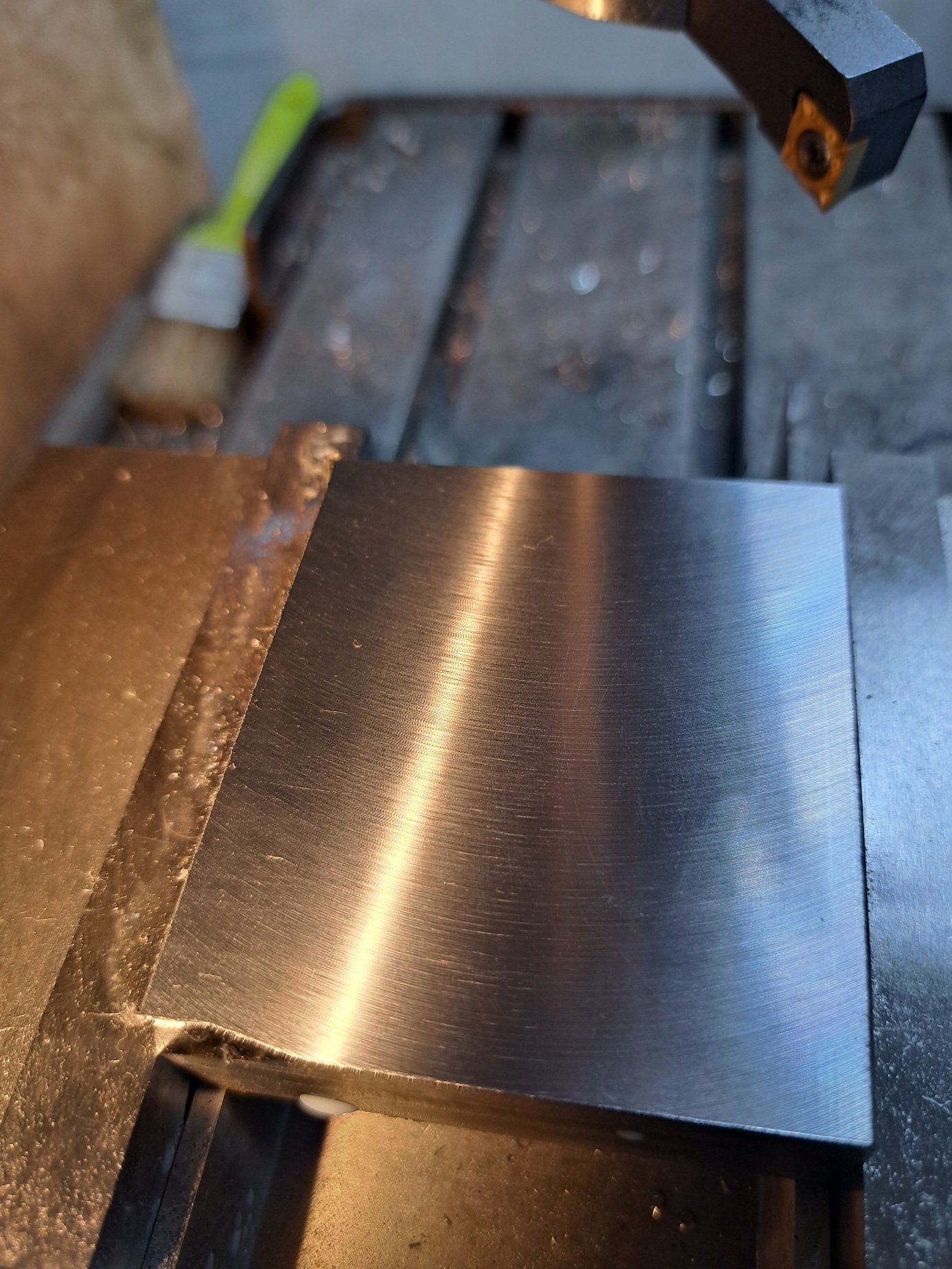 Hotovo. Uz jsem otestoval, ale na chlubeni to jeste neni. Porad tam jsou viditelne stopy. Frezka umi posuv nejmin 25mm/min. Otacky jsem zkousel od 200 do 800 a nejlepsi vysledek se mi zdal kolem 500. Zkousel jsem hloubku od 0.1 po 0.05. Nejspis jeste zkusim jeste jiny platek a az bude cas, tak i radeco. Mazal jsem emulzii Jinak se mi libi, ze konecne muzu relativne rychle srovnat vetsi plochu.