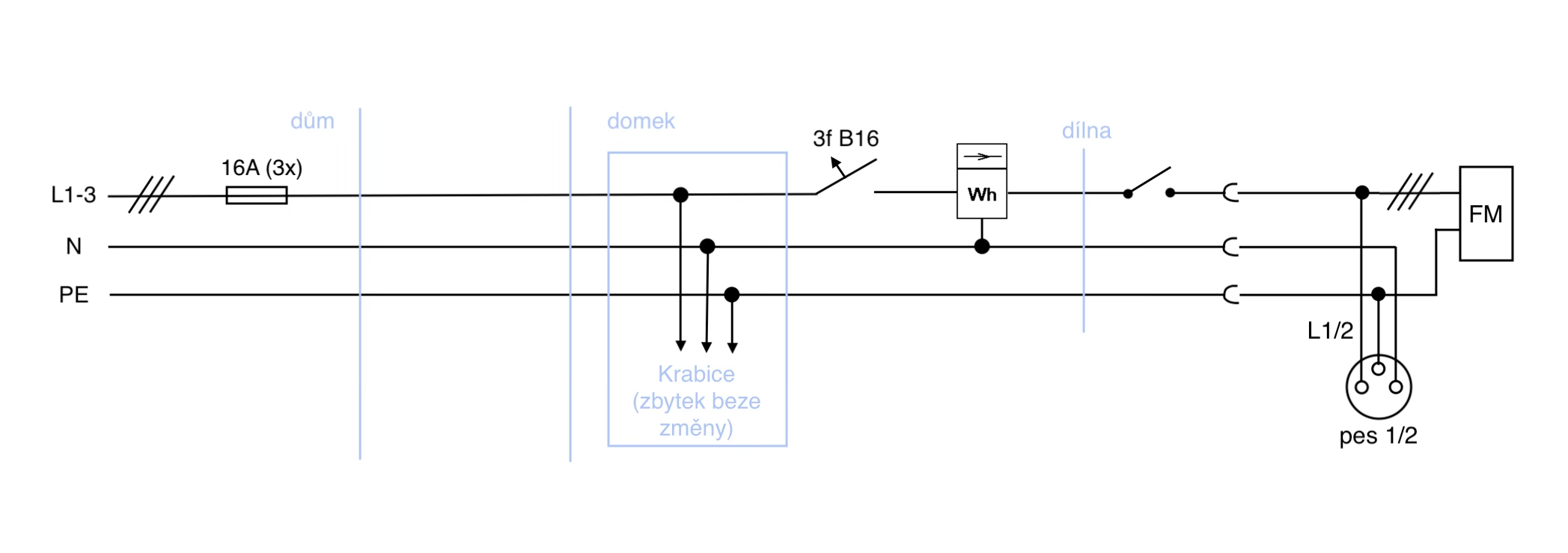 Úplně tomu popisu nerozumím, zapojené je to takto:Charon píše: ↑9. 8. 2023, 3:12 Buď je to podružák, který je jištěnej nebo aspoň vypínanej třífázově někde u hlavního, pak pojistky jsou vývody jednofárové, budiž, ale jistič nemá být za nima, ale připojen s nima na přívodu. Že by tam měl být hlavní vypínač.... dejme tomu. Jistič jistí ten vývod k tobě, ne spotřebiče.