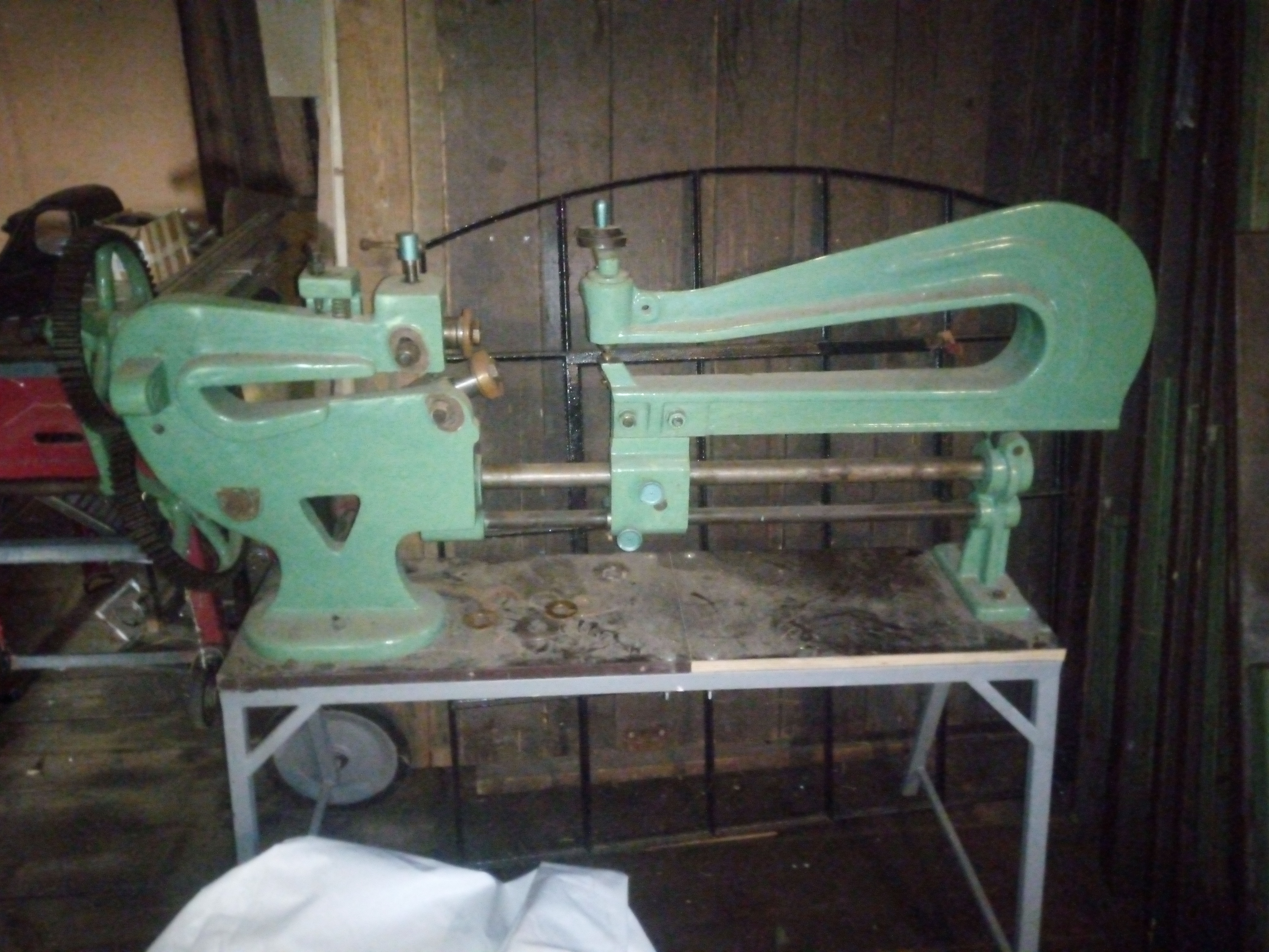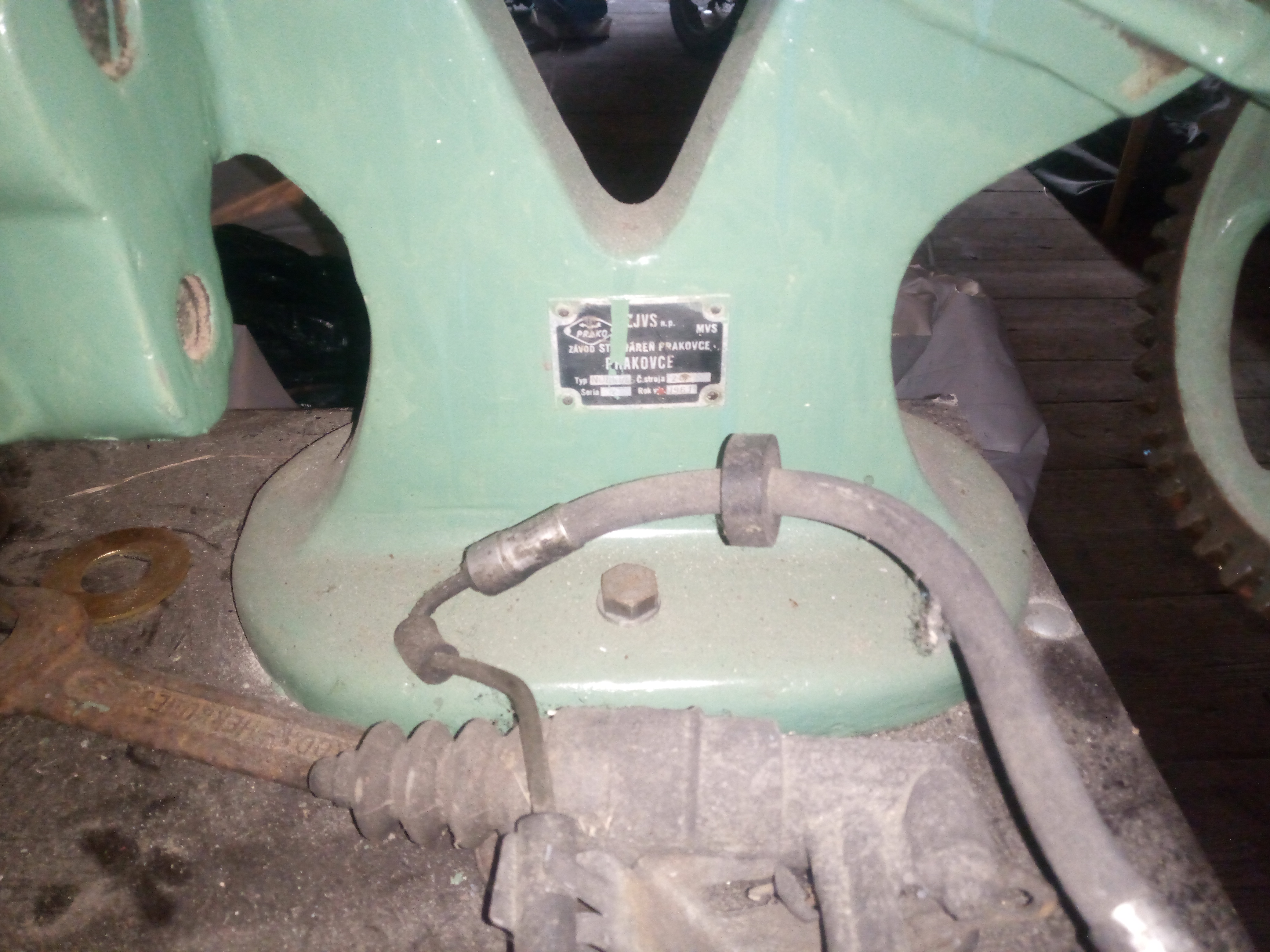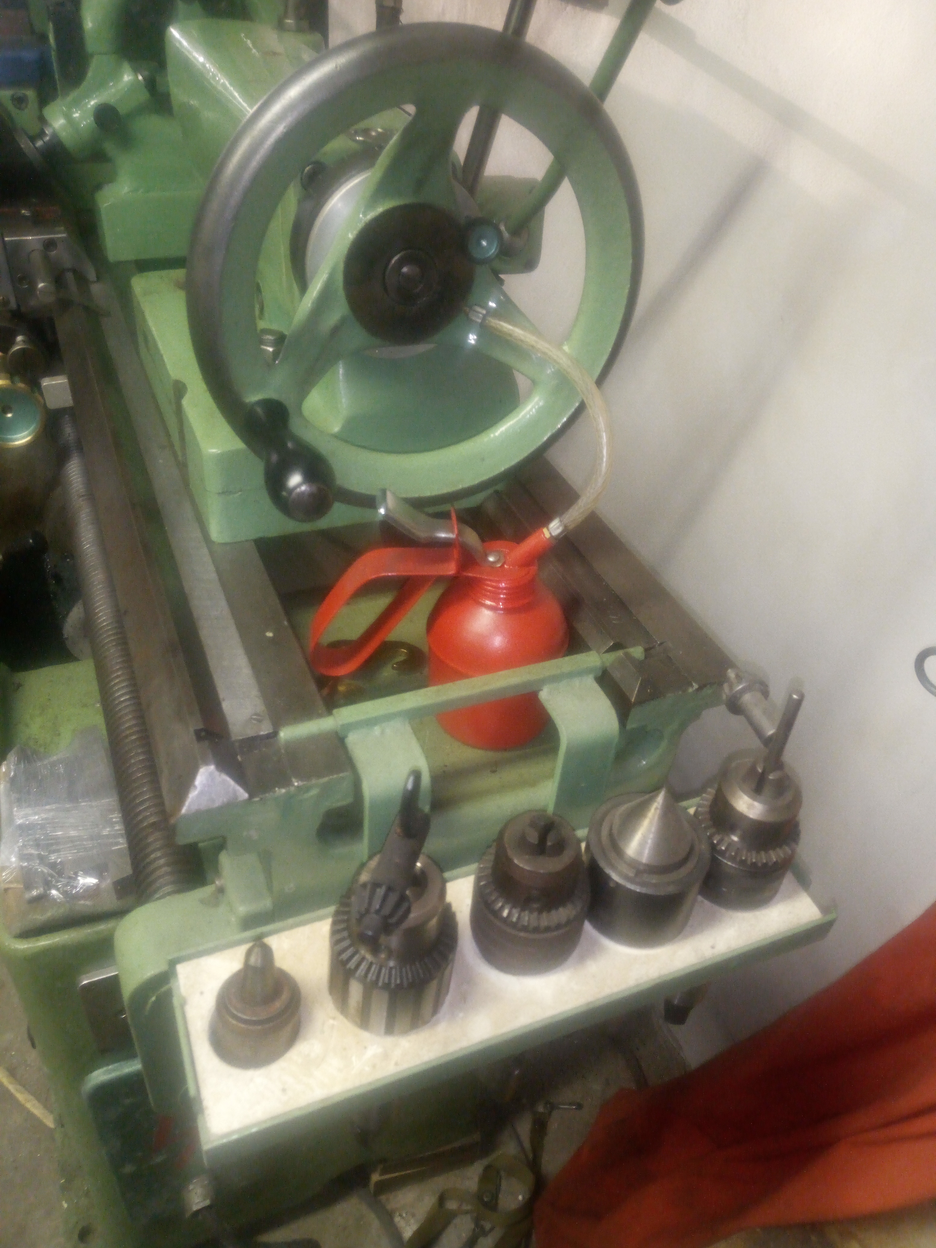 Transmisák původně na dřevo, ve vřetenu a pinole krátký 2ka kužel, různé unašeče a dlouhá opěrka, na soustružení třeba noh stolu. Já ho používal na kovotlačení. Motor 1,5kw, tága na tlačení můžu dát k němu. 9990kč