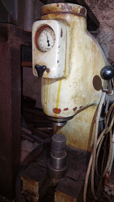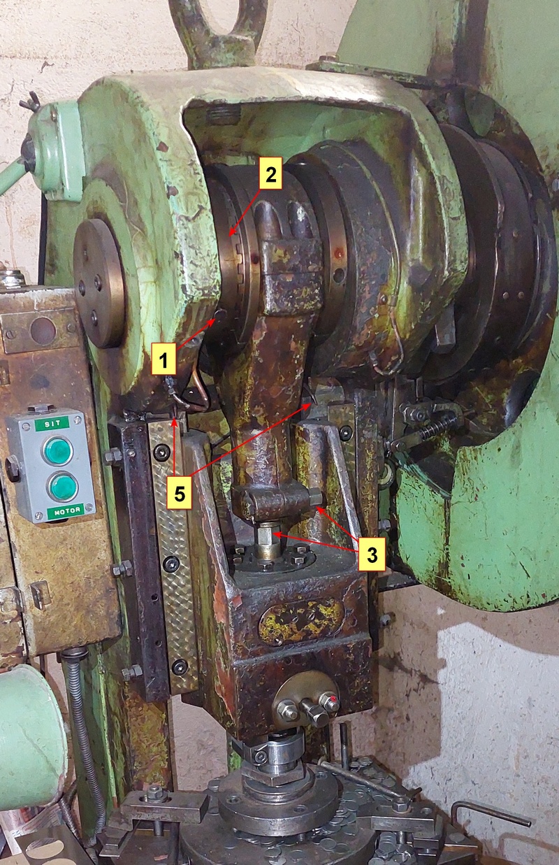 K lisům je ale problém sehnat info, Aktuální zdvih 25mm bych asi chtěl snížit, nejspíš se to dělá vyndáním klínku (1) a pootočením ozubení (2). Povolením a pootočením šroubovice (3) se asi přibližuje hlava ke stolu. Někde bude i nádoba pro mazací čerpadlo, má to mazací trubičky (5). Nastavit razník bude chtít pomalu pohybovat beranem, asi oddeklovat setrvačník a pootáčet jím. Tyhle lisy jsem nikde nenašel, asi už je to moc staré, i když to mechanické spouštění, bez kompresoru , mi přijde dobré. Pročíst si ale návod by bylo zajímavé. Ani nikdo v okolí tenhle lis nepamatuje, i když mechanicky je to obdobné jako novější.