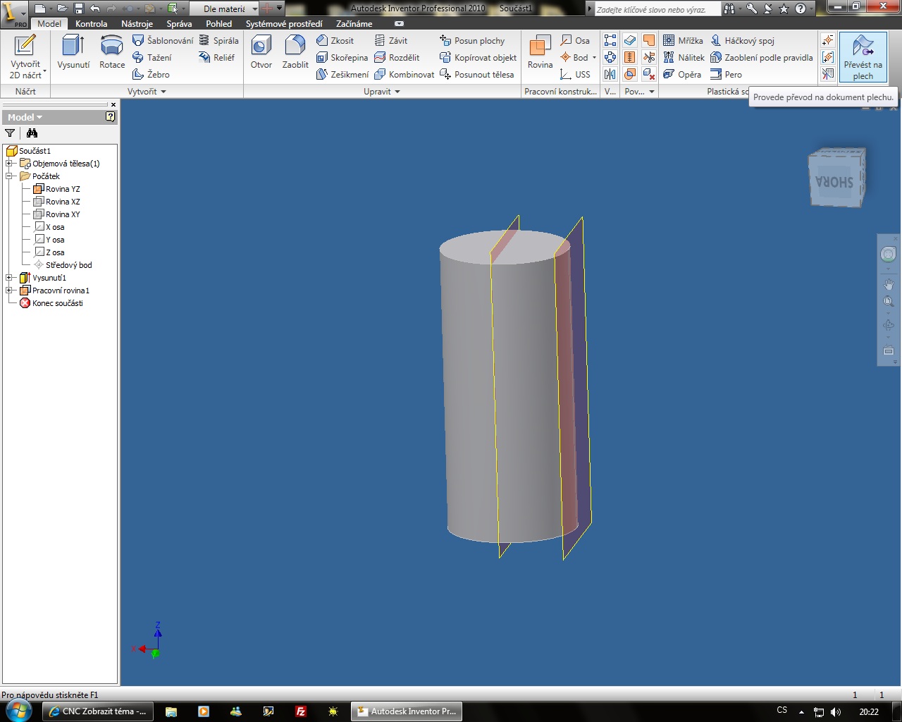 No tys totiz tu pracovni rovinu nevytvoril podle toho co pises. Klikni na nejakou zakladni rovinu a az pak na tu plochu valce (musis mit dva prvky na vytvoreni te roviny tim ze oznacis tu zakaldni rovinu reknes ze ta tvoje pomocna rovina budes s tou zakladni rovnobezna, a tim ze vyberes obvodovou plochu valce tomu reknes ze bude odsazena tak aby se dotykala valce)
