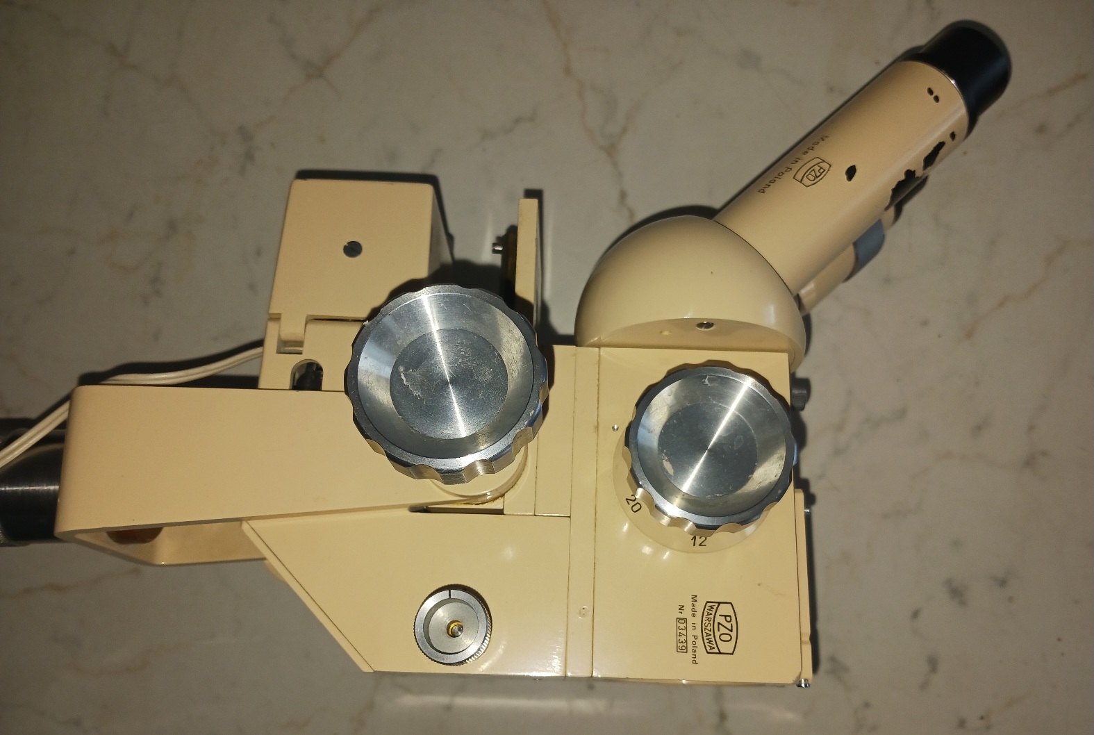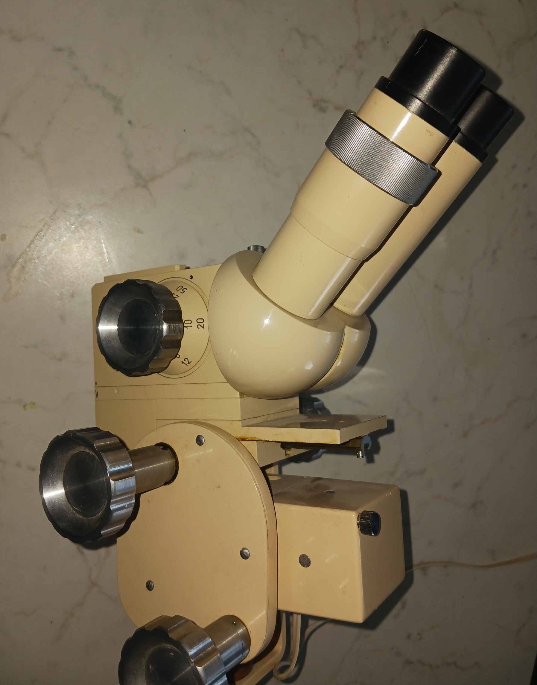 Operační mikroskop. Přepínání zvětšení 4 až 50 záleží na objektivu. Schází žárovka jinak ok.