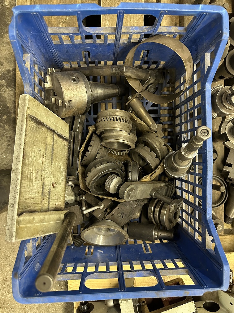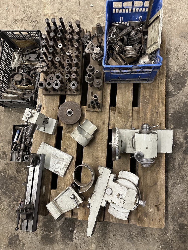 prave aj lave otacky s regulaciou, niekolko prirub na kotuce, ISO 40 kuzel v delicke, vsetky priame iso kliestiny,deliace kotuce, niekolko konikov, 2 hrotove pristroje, odpruzene hroty, 2 delicky,radiusovy pristroj, 3osy zverak, radiusovy(tvarovy) orovnavac, vreteno na vnutorne otvory