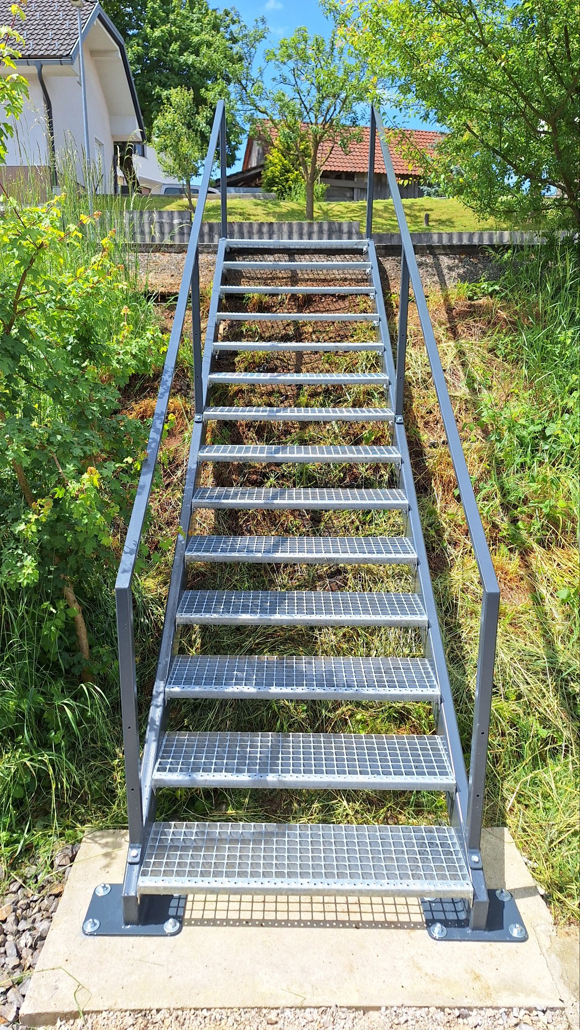 schodiště je hotové. Bočnice (schodnice) jsou z profilu 150x50x4, porošty jsou přišroubované samotvářecími šrouby Taptite M10 přímo do stěny profilu, ukotvení jen na koncích, v betonu jsou závitovky M12 (chemie Sika AnchorFix-1). Je to o dost lehčí konstrukce (a vše kolem), než k jaké se tady dospělo, troufli jsme si to tak udělat na základě doporučení místního mistra, který to tak děla za peníze přes 20 let a ještě mu to nikdo na hlavu nehodil (rozhodnutí nebylo úplně na mě, tak mě nekamenujte, ale musím říct, že jsem to při mnohačetné manipulaci docela ocenil). Malinko (ale fakt nepatrně) to skutečně pruží, za mě naprosto v pohodě. Jak bylo předpovězeno, ze zinkovny se to vrátilo s několika otvory v zábradlí navíc a sváry vylezly až hamba, ale jinak dobré, nepokroucené, jsme všichni spokojeni. Šlo to přímo pod barvu, takže zinek jsem neviděl, neposoudím. Ve sloupcích zábradlí je příprava pro výplň lanky, na vrch možná přijdou dřevěná madla.