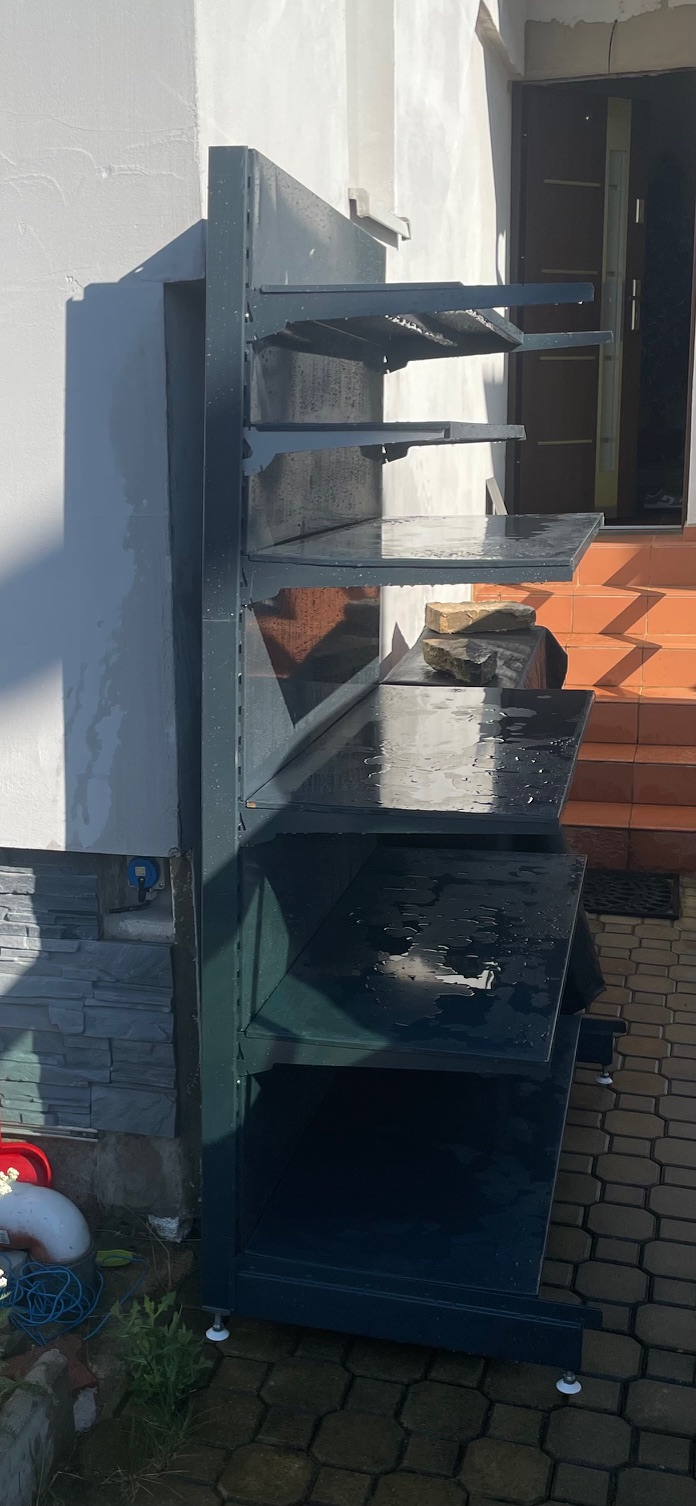 6 vyztužených polic (4 široké a 2 poloviční), štelovací nožičky pro vyrovnání nerovností podlahy