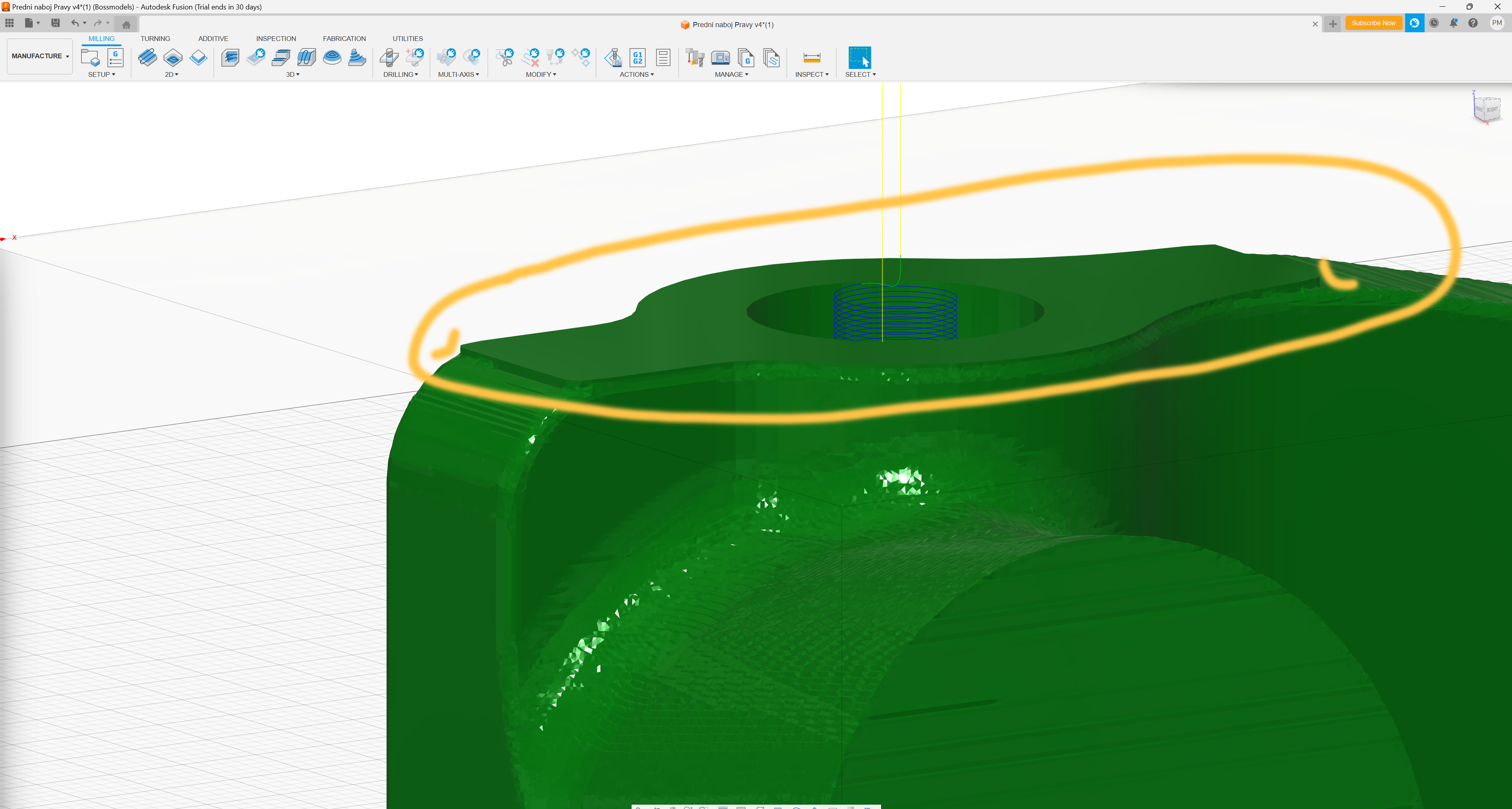 nevíte proč mi nechce Fusion obrobit ten šedý kousek nahoře? Nebo jinak.. Je to čelo, které bylo zarovnáno a mělo by bát v -0,1mm výšce. Pak to mám tedy celé obrobeno níž. Nechápu to.