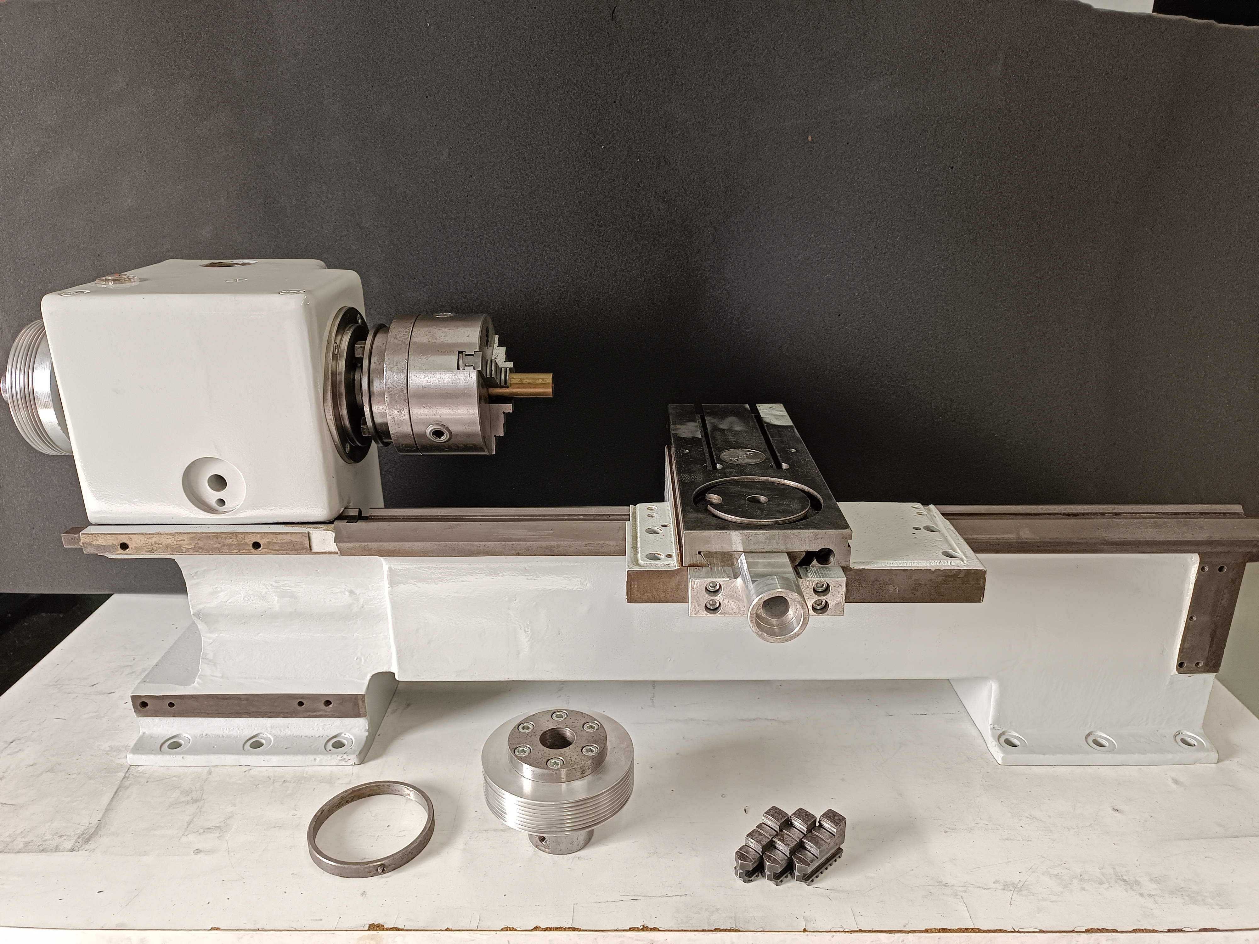 Nové ložiska na vřeteni. Lože a suport profi přebroušené na bph a spasované. Lože a vřeteník vybroušené, vykitované a nastříkané polyuretanem. Je k tomu řemenice na motor a ke sklíčidlu opačné čelisti. Sklíčidlo je průměr 125 mm. Vše co je na foto. Nic víc k tomu nemám. Při rychlém jednání přidám kluzné pásy Turcite včetně lepidla na olepení kluzných ploch (ale není to potřeba. Sm16 chodila kov na kov. )