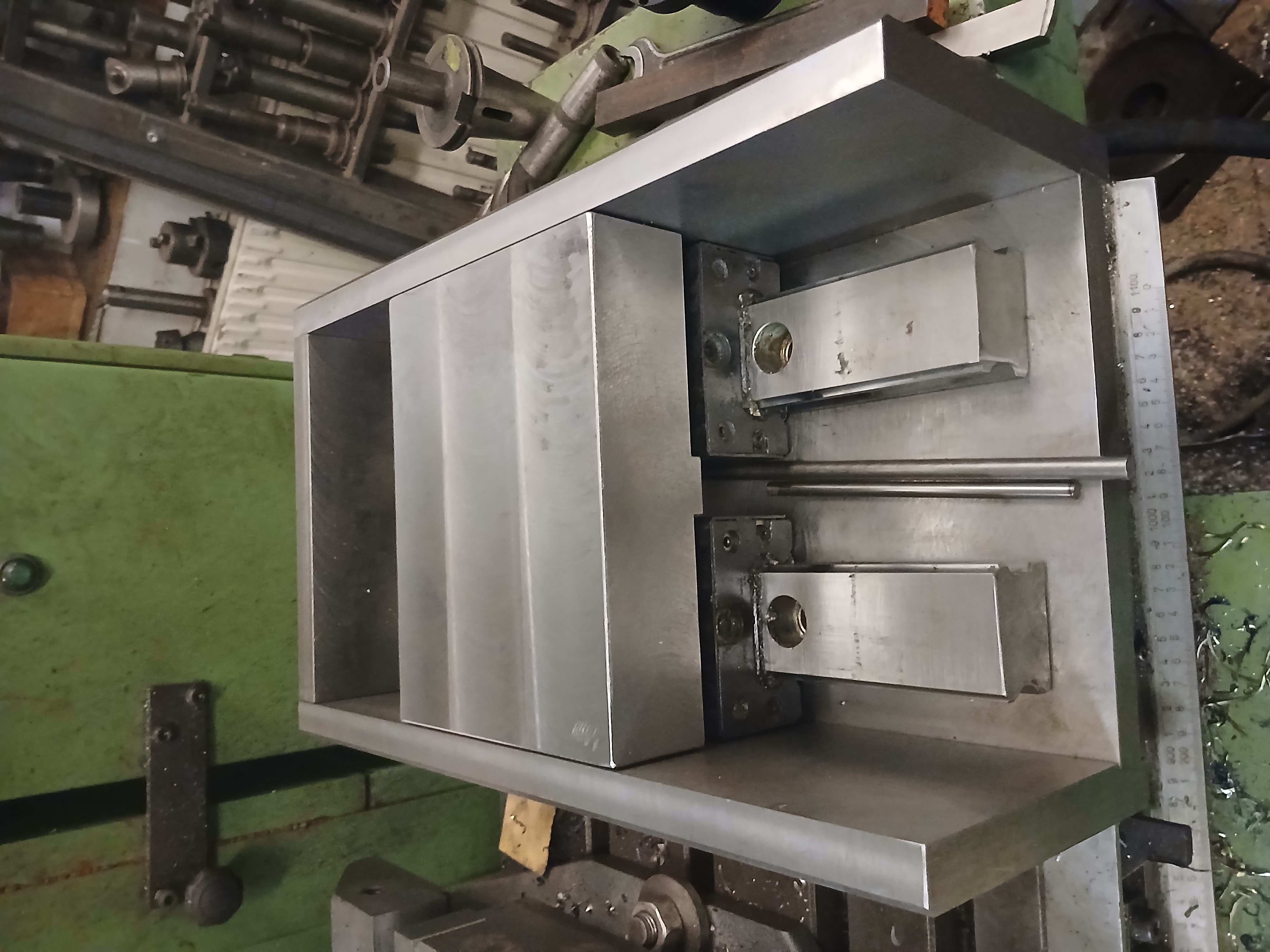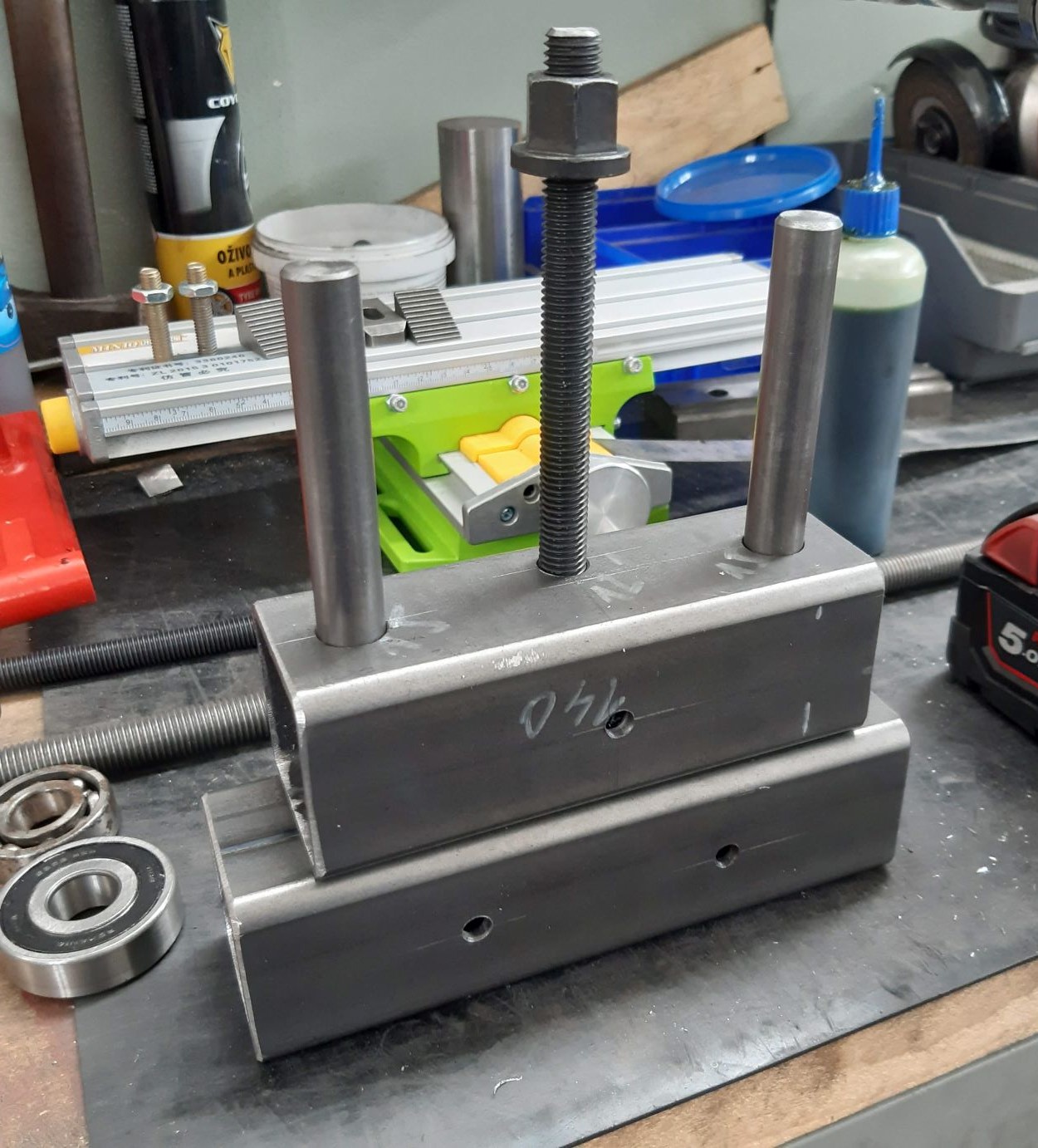 Pak už jen chvilka práce na soustruhu - protočit trubku uvnitř na průměr pro nalezené ložisko a vyfrézoval jsem si drážku pro kliku. Pár děr na stojanovce do jeklů pro hlazenky a závitovku, ty jsem si zaříznul na stejnou délku asi 120 mm. 2x2 otvory pro spodní hlazenky, na která jsem navlékl ložiska. Ukončeno 2x větší podložka se šroubkem. Z pásoviny 30x6 délka asi 250 mm jsem si ve svěráku zhotovil ohyb kliky, provrtat díru na konci pro kliku. Tu tvoří šroub M10x80 s navlečenou trubičkou. Toť vše. Práce soustruh, frézka, vrtačka + pár svarů asi 2 hoďky. Asi nejsložitější díl, příruba kliky