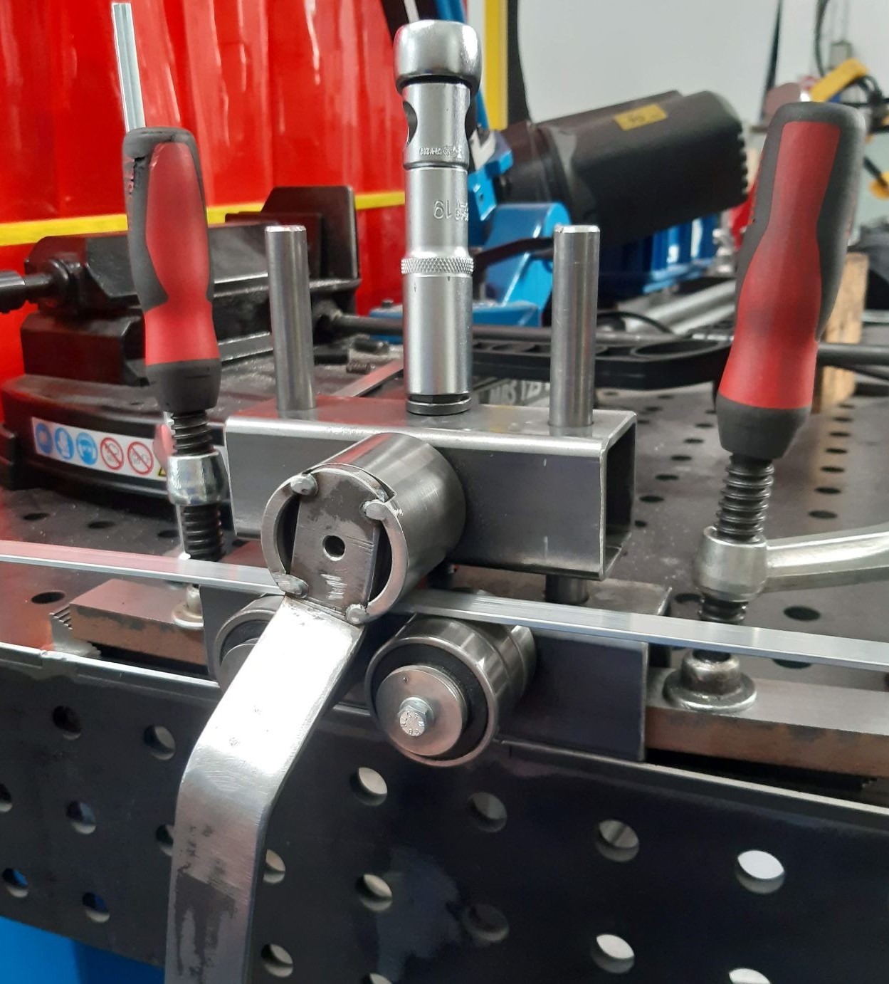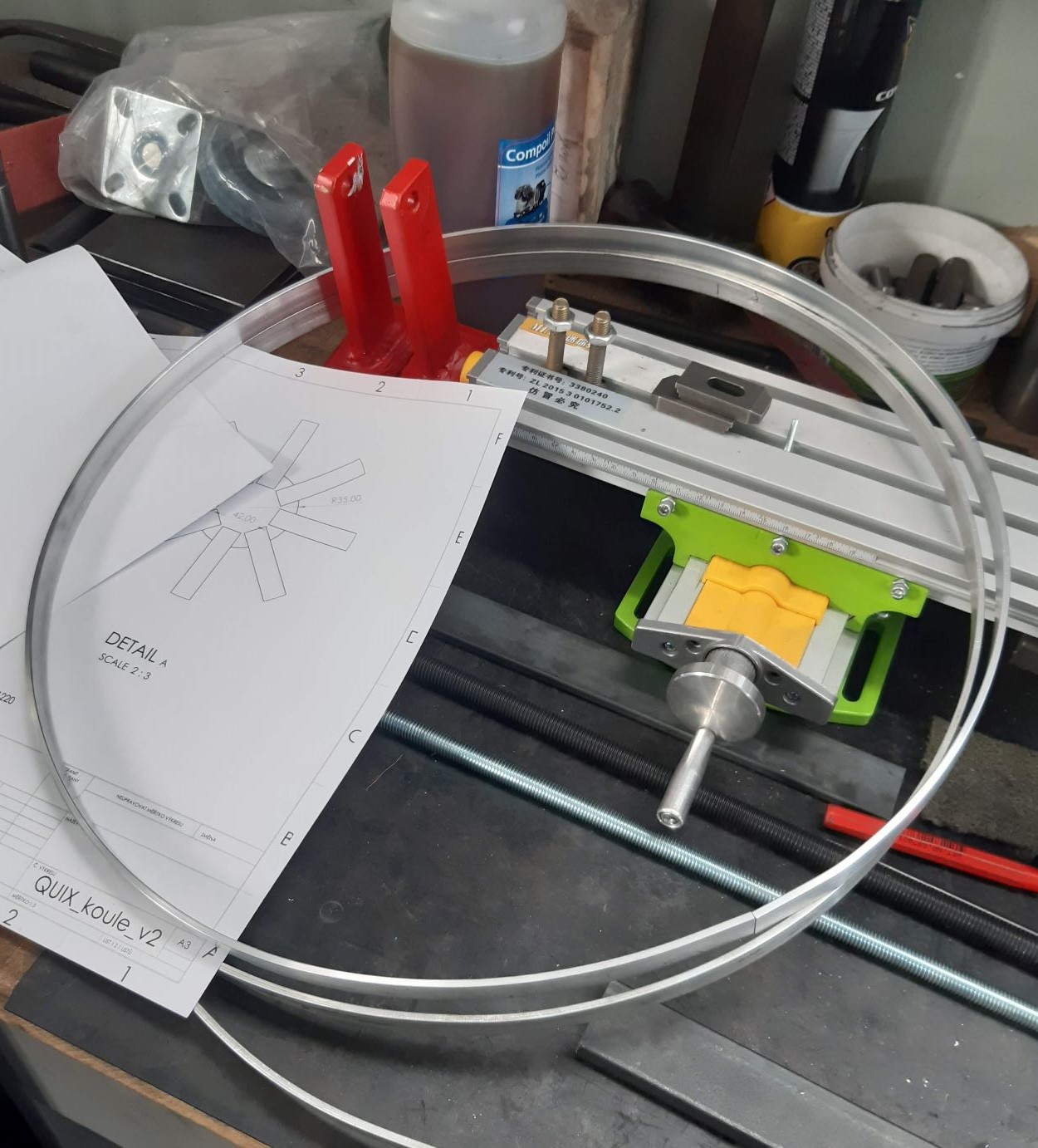 Také si tedy dovolím přispět a trochu se pochlubit, i když nic světoborného. Potřeboval jsem stočit kroužky z pásovinky 15x3 mm průměr 100 a 400 mm a obří stáčečka profilů takové titěrnosti nedává. Je to na ní moc malé. Tak jsem mrknul pod ponk do zbytků a za necelé tři hoďky jsem si vyrobil malinkou příruční stáčečku profilů, no a maká jak dráha