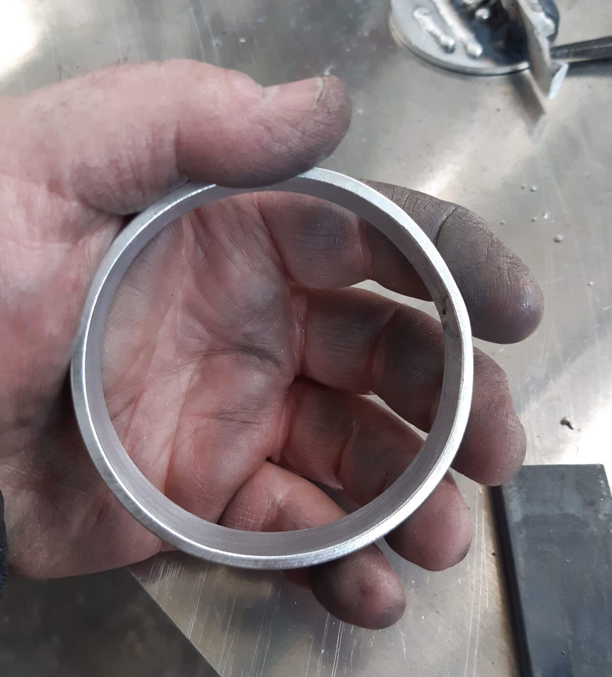 Připevňuji pouze svěrkami ke stolu nebo k ponku, postačuje to. Stáčí parádně, a to i konce materiálu. Přitahování mám jen na matici, na kterou si nasadím ráčnu s příslušným ořechem. A zde již výsledné výrobky, malý i velký kroužek.
