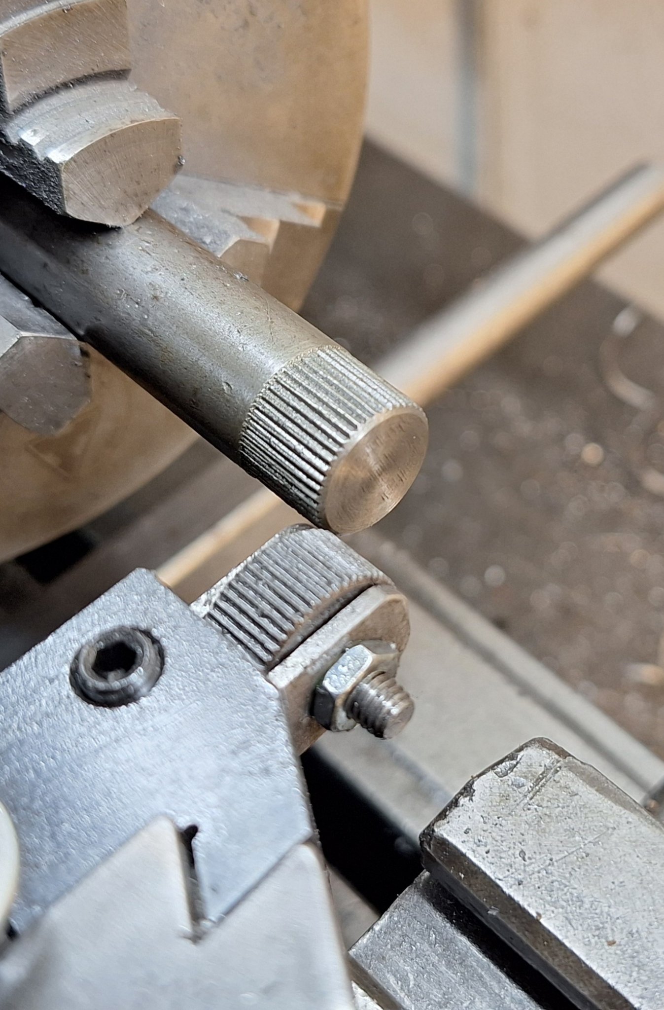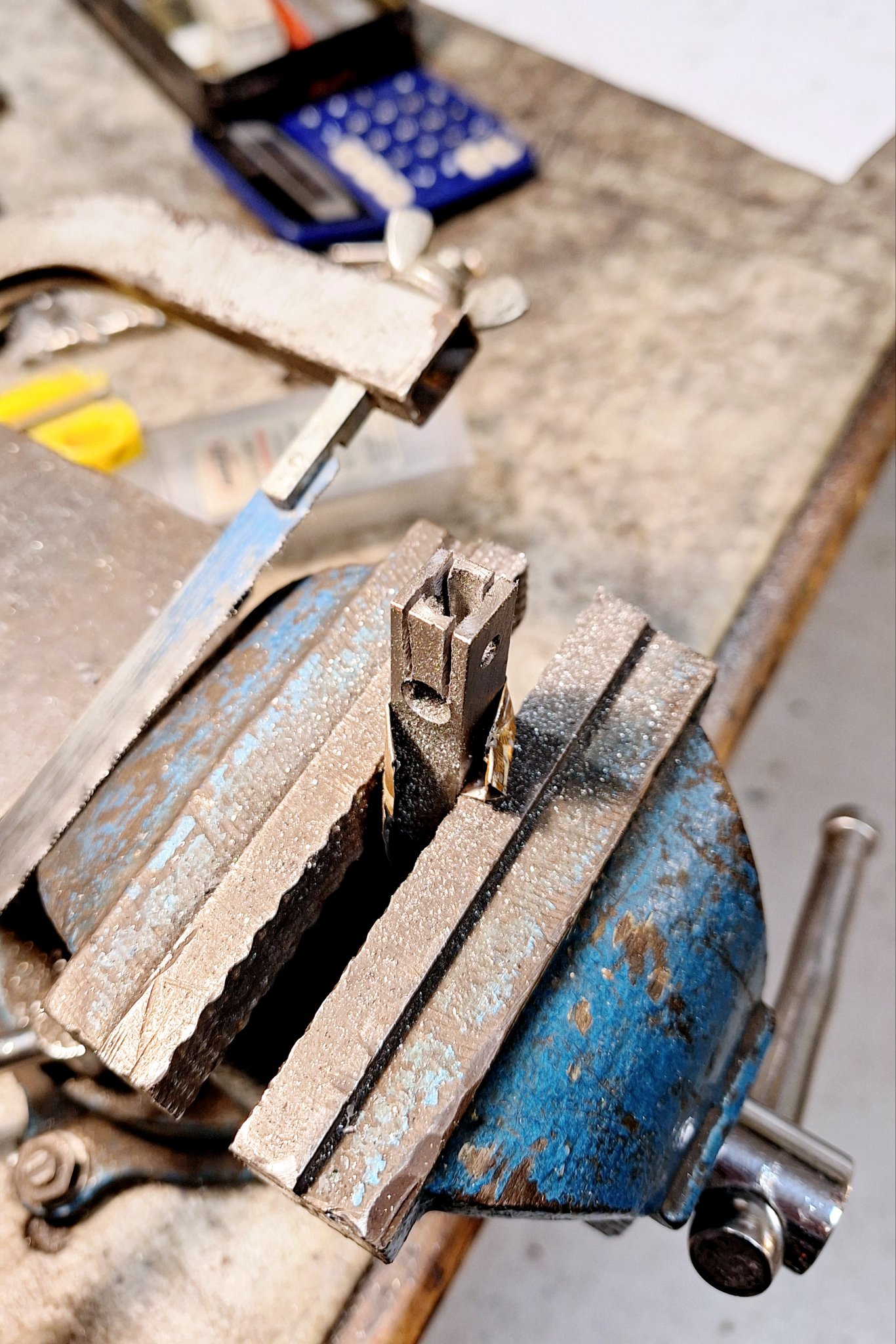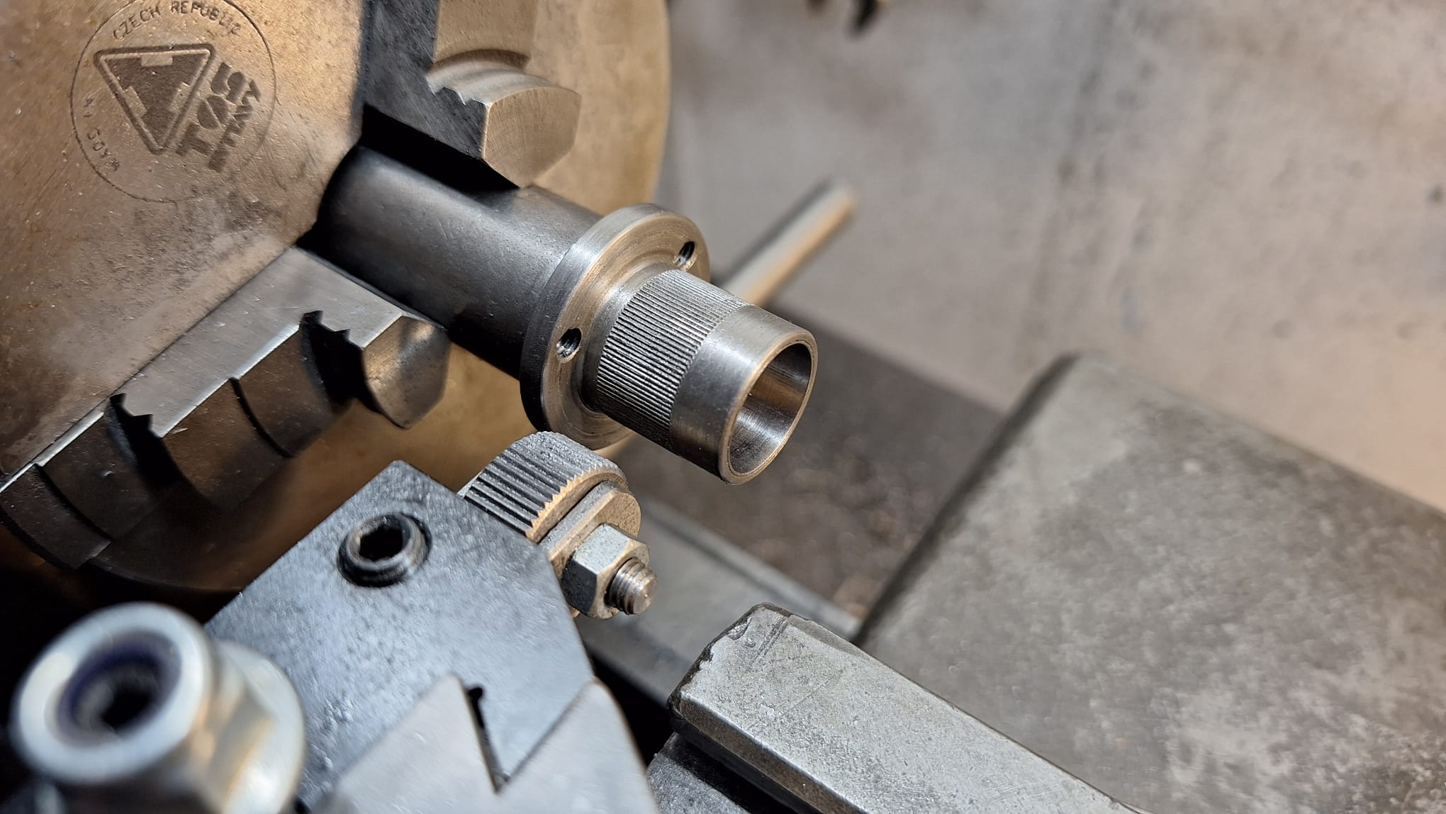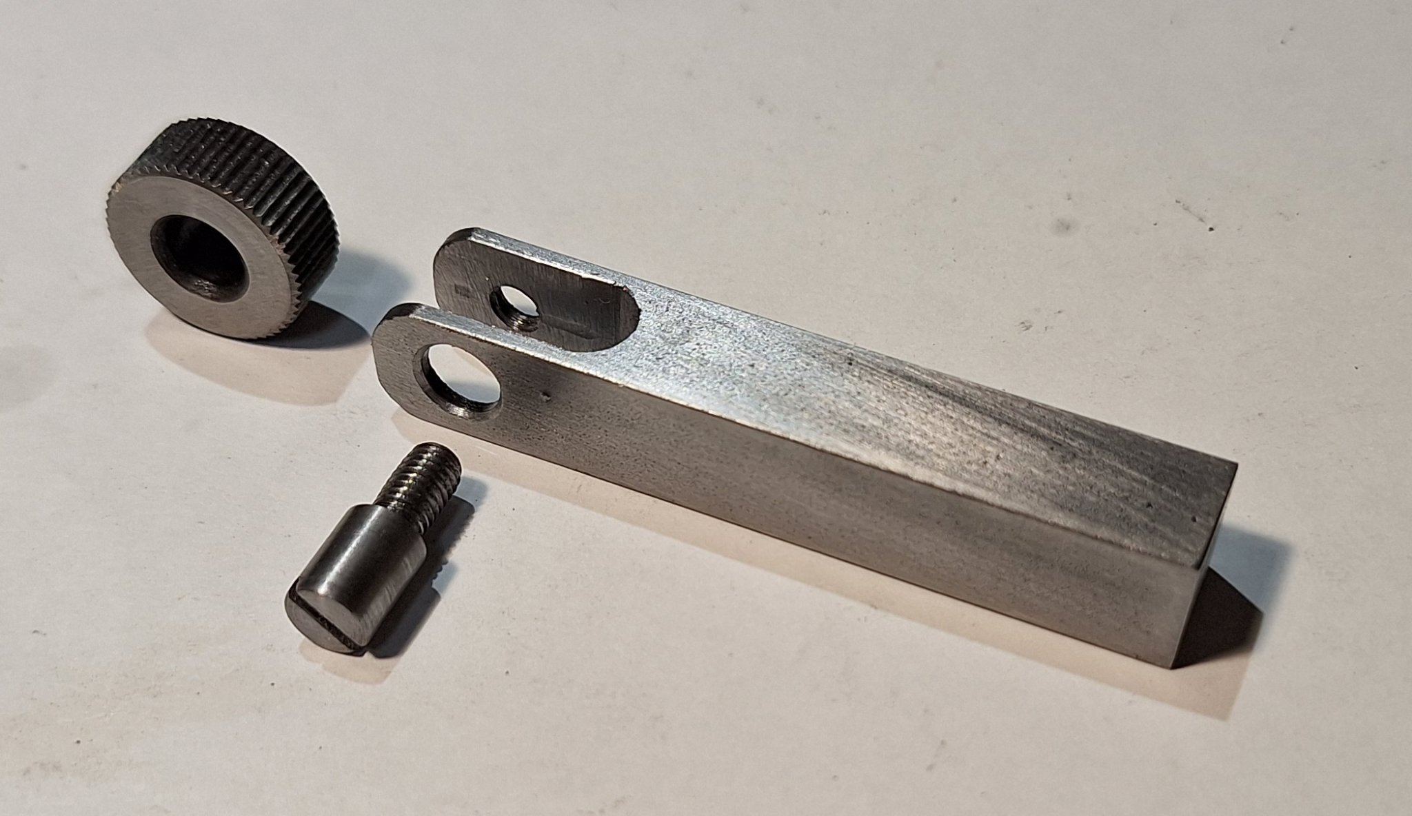 Na frézku zatím nemám místo a než bych si to připravil na frézovacím přípravku, tak by byla půlnoc. Mohl jsem to frézovat rovnou v nožovce, ale to se mi dříve moc neosvědčilo. Tak jsem to jen rozvrtal, co to šlo (na soustruhu) a udělal takto, šlo to docela rychle.