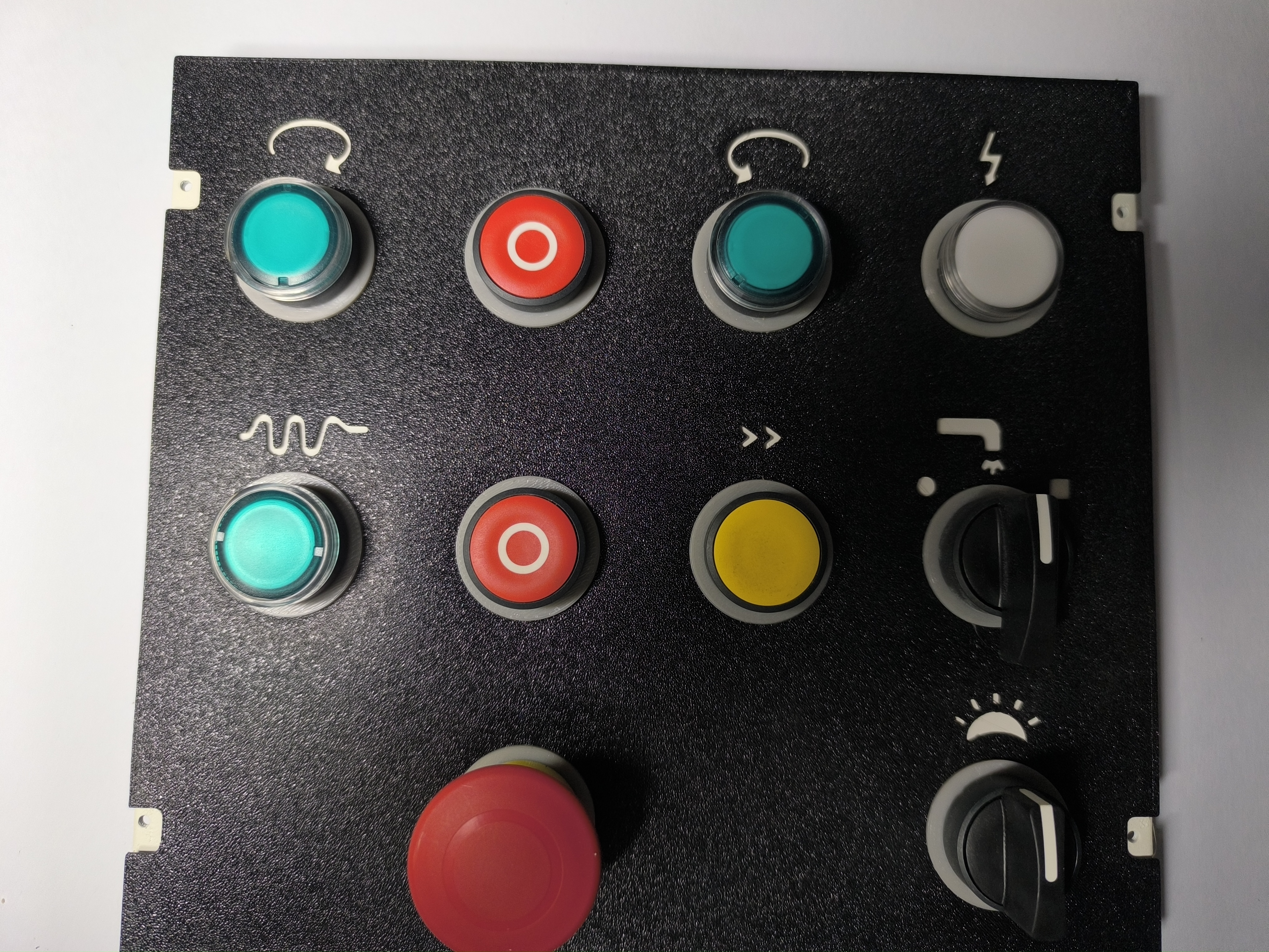 Vyřešil jsem to tak, že jsem vytiskl z PETG náhradu hliníkového překryvného plechu. Symboly jsou děravé skrz a podkladový ocelový plech je nastříkán na bílo. Viz fotka, kterou jsem přiložil. To PETG je cca 0,7 mm tlusté, takže nepředpokládám, že by je bylo možné proděravět ohmatáním. Podkladová bílá barva je až za tímto překryvným PETG, takže ji také nelze ohmatat. Pro ilustraci přikládám expandovaný pohled.