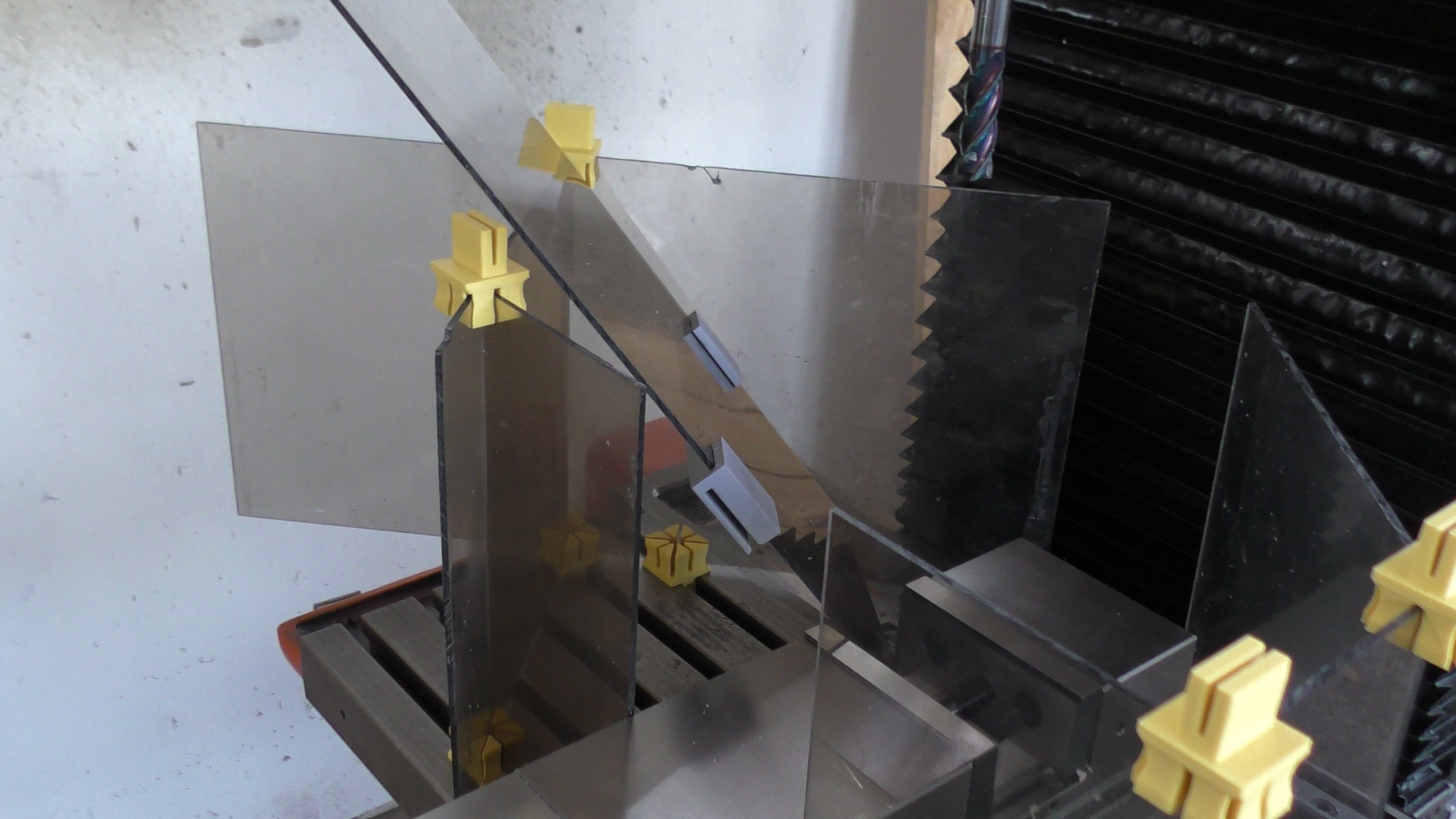 Tak po 4 dnech zkušeností s akvárkem musím souhlasit, že akvárko není to pravé ořechové. Takže jsem provedl myšlenkovou revizi a dospěl jsem k variabilnímu řešení s jedním typem univerzální spojky do T drážky a přířezy polykarbonátu. Plus snadno odnímatelná přední dvířka, která lze vertikálně posunout a tím fungují i se svěrákem. To si mohu sestavit, jak potřebuji. Funguje to dobře. Spojek jsem si vytisknul asi 20 kusů, takže sestavím prakticky libovolný kryt. Spojky jsou násuvné do T drážky, takže žádné upevňování - jen nasunu a je to. Navíc mohu sestavit kryt natěsno okolo frézované části, takže špony zůstávají jenom na malém kousku.Zbýňa píše: ↑4. 5. 2025, 9:09 Největší "bordel" je od špon a emulze při rozvrtávání, kdy se špony motaj na vrták a rozhazujou emulzi nebo odlítávaj po okolí. S touhle sestavou si nedovedu představit rozvrtávat výsuvnou pinolou. Jednak se k páce pinoly blbě dostaneš a když si stoupněš zepředu a otevřeš dvířka, tak se nedostaneš na páky posuvů.