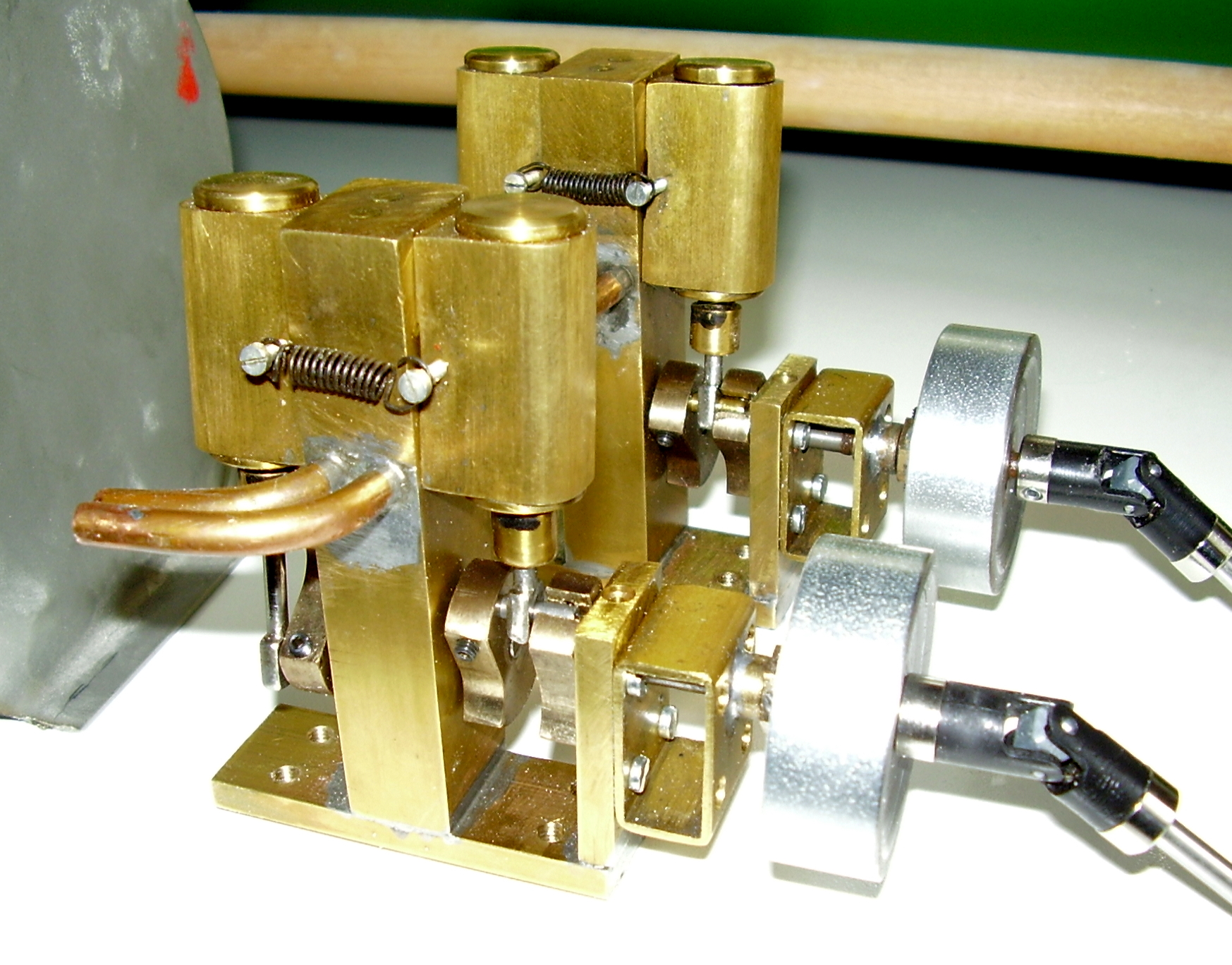 Natáčel to můj kamarád.Jde to přehrát VCL media player.Ostatní nevím.Zkouším dát nějaký fotky těch strojků.Takže my jim říkáme "Kejvačky"průměr deset, zdvih 16 mm.Větší kousky jako jsou ,základna a válce jsem si nechal nařezat z mosaznýho kusu,následně některé kousky mi udělala frézka(extentry,pístní tyče)ostatní na soustruhu .Jo a na CNC jsem si ještě naděroval přesné rozměry děr a vyvrtal na st.vrtačce.Kotel mi svářel kámoš volframovou jehlou z nerezu.Průměr 110 mm ,vevniř plamencová 40 mm trubka propojená ještě čtyřmi 10 mm trubičkami.Hořáky mám dva od Mevy asi 1Kw.Plynová kartuše z tur.vařičů mi bude kotel ohřívat.Model na snímku je francouzký parníček z roku 1904.Délka 108 cm ,šířka 25 cm.Až to rozjedu ,pošlu sem video.
