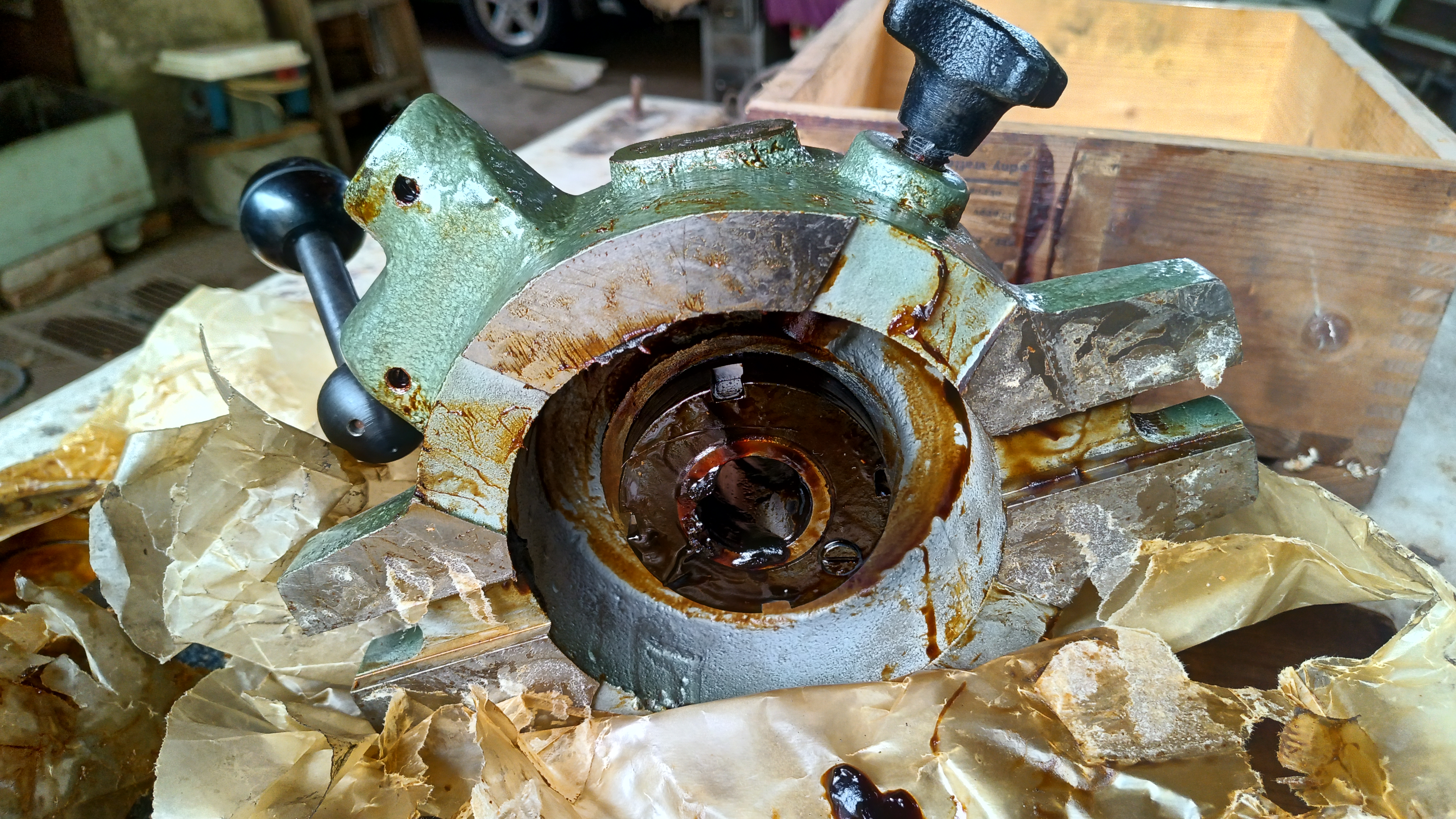 Prodám otočný dělící stolek, 40let nový. :D Průměr 150mm, ve středu je Mk4, v ploše 4* M8 a díra s pouzdrem pro určení polohy. Plynulá brzda + aretace na polohy dle použitého dělícího kroužku. Kroužky 12 a 24 poloh, vyměňují se po demontáži stolku z těla. Páka s koulí slouží k odemknutí, otáčení se provádí rukojetí (tyčkou) pomocí děr zboku stolu, zamknutí samočinně pružinou.