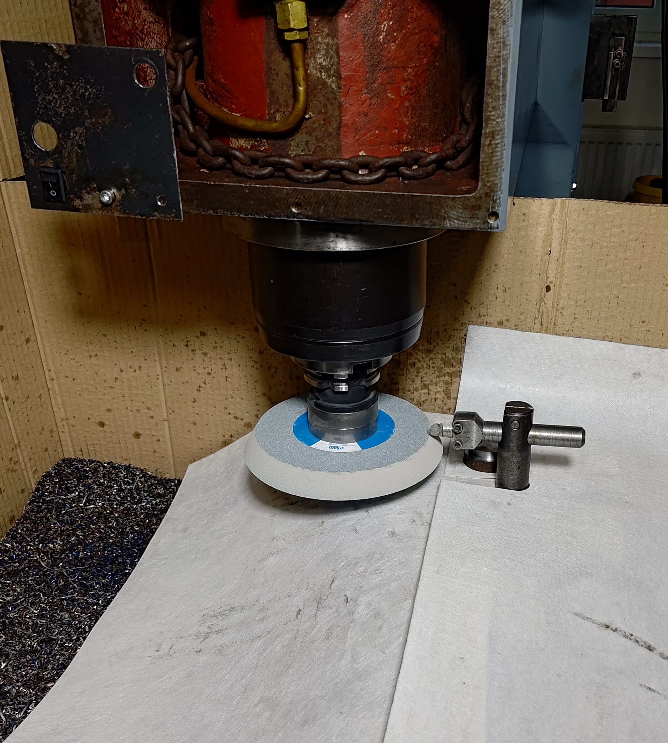 Brousil jsem na mé VMC-850 ale zvolil jsem moc jemný kotouč - 240, zalepoval se a pálil, musel jsem opatrně. příště bych šel asi do 100. Brousil jsem jen lehce tak aby se většina plochy začistila a abych nemusel vyrábět nový klín pro štelování vůle.