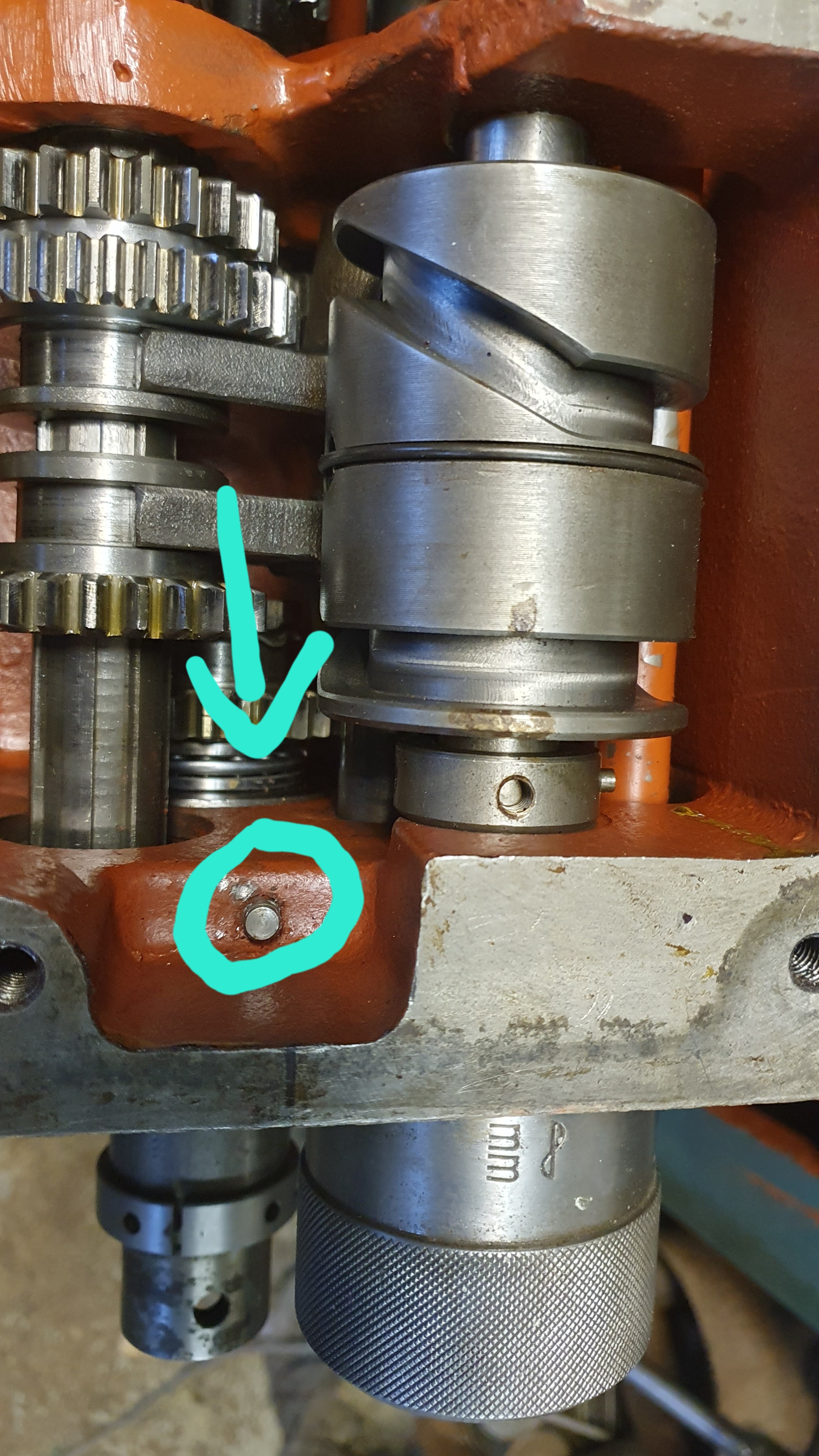 Tak dneska jsem vytahl ten náhon na závitovací tyč pod tím. Je tam dle všeho asi mazací kanálek. Takže ten štěftík tam bude zřejmě jako zaslepení technologické dírky pro to mazání. Ještě to prověřím.