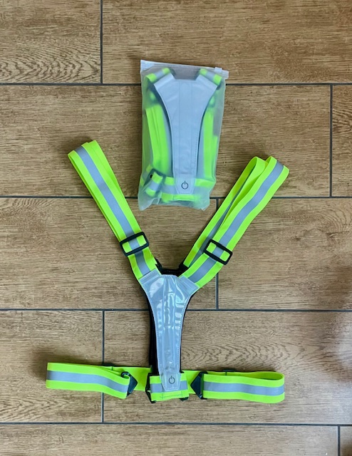 LED výstražný postroj - nabíjecí přes USB, jeden LED pásek v předu, jeden v zadu, oba jsou na sobě nezávislé a každé může svítit jinou barvou nebo i blikat jinou barvou, takže se můžete cítit třeba jako motocykl, vpředu svítit bíle a zezadu červeně :-)