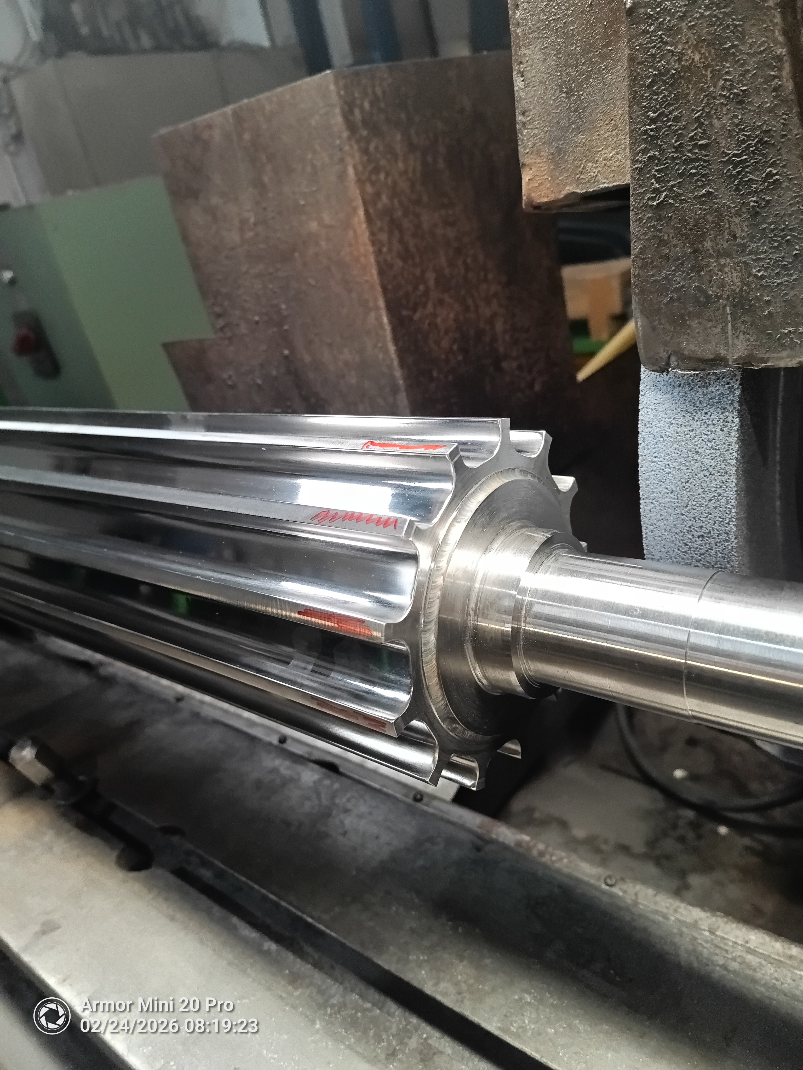 Dnes brúsenie podavacieho valca. Zvarenec z AISI 316, brusenych 7 priemerov, max priemer D160, dĺžka 1240mm. Na veľkom priemere D160 je 13 pozdlznych drazok, čiže meranie o niečo náročnejšie.