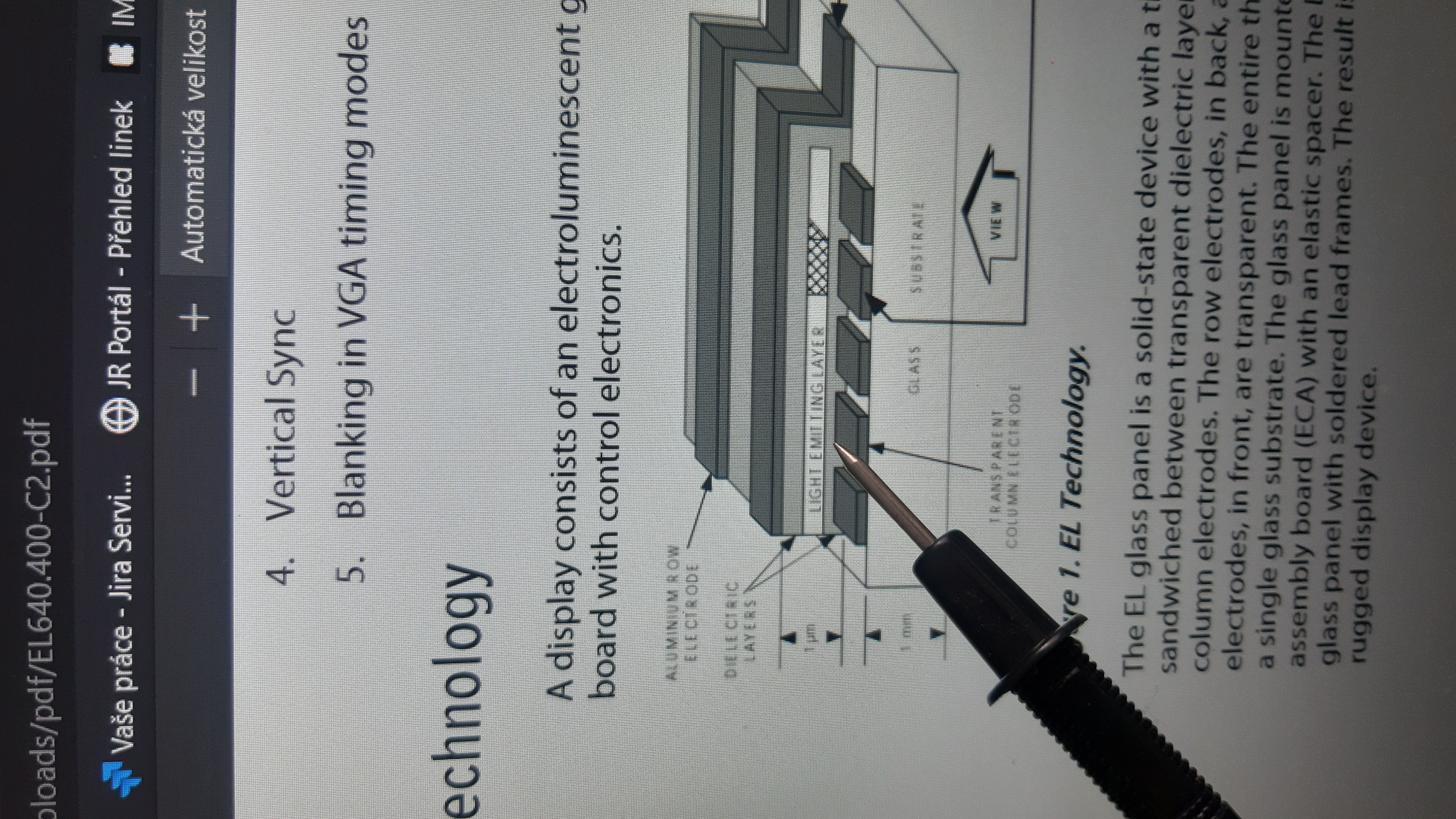 Výstup který potřebuji konvertovat je monochromatický signál 5V TTL složený z VCLK 10MHz, HS 25kHz, VS cca 63Hz a jednobitový pixel signál. Změřeno osciloskopem a přečteno z datasheetu tady.