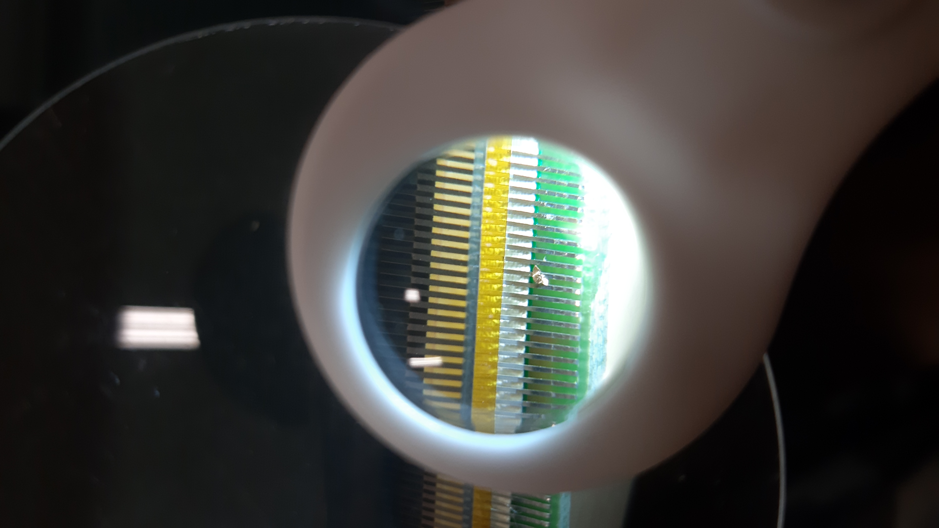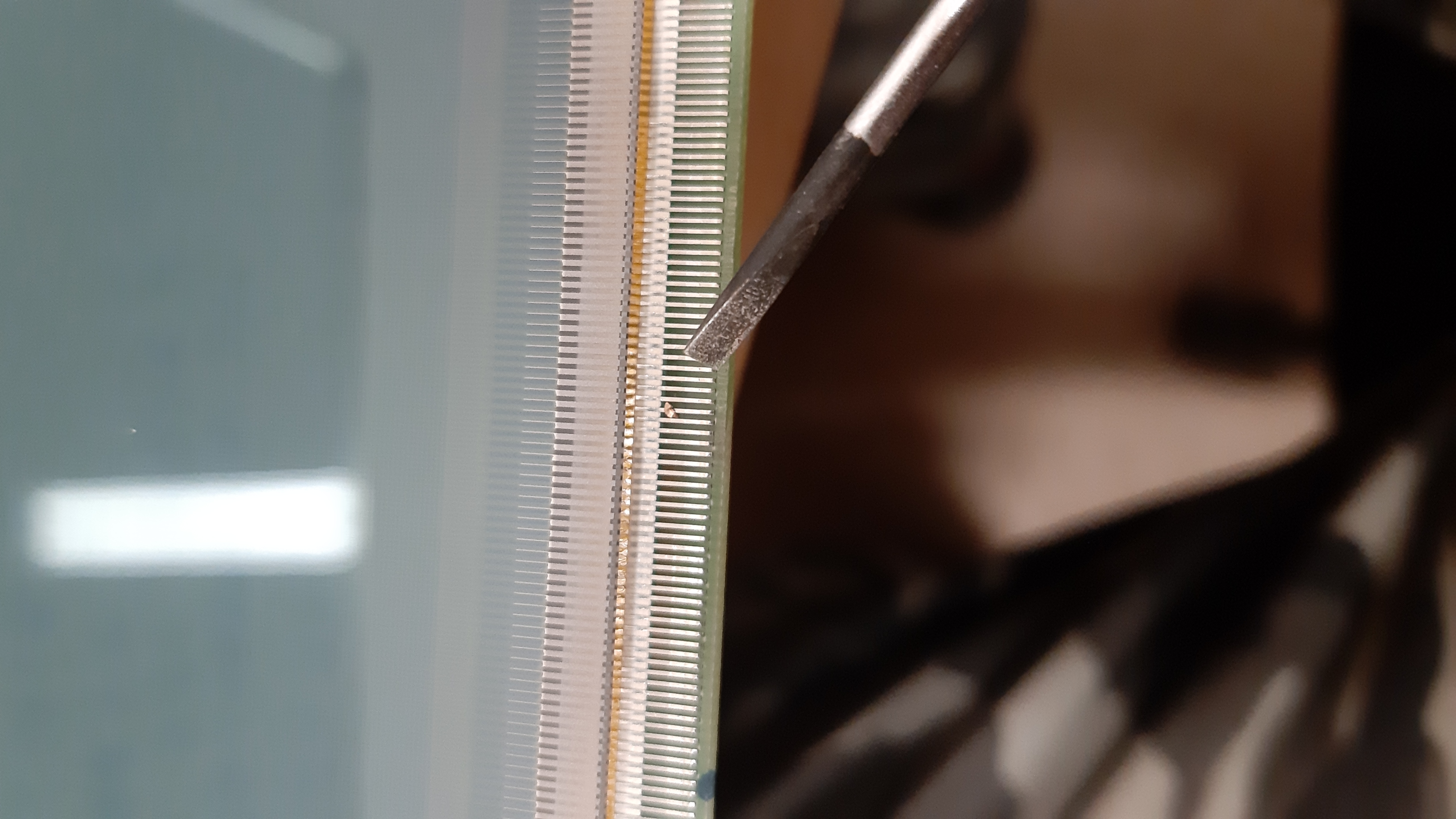 Já myslím, že oprava toho displeje asi nebude pro mě správná cesta. Je to strašně titěrný, pod lupou jsem na flexibilním spoji našel miniaturní šponku asi mosaz. Viz. foto. Ten displej je přilepený na vícevrstvým tišťáku a kolem dokola je napařený ten flexibilní spoj (nepájitelný, je to cca 0,1 rastr). Myslím, že náhrada za jiný displej bude dobrá volba.