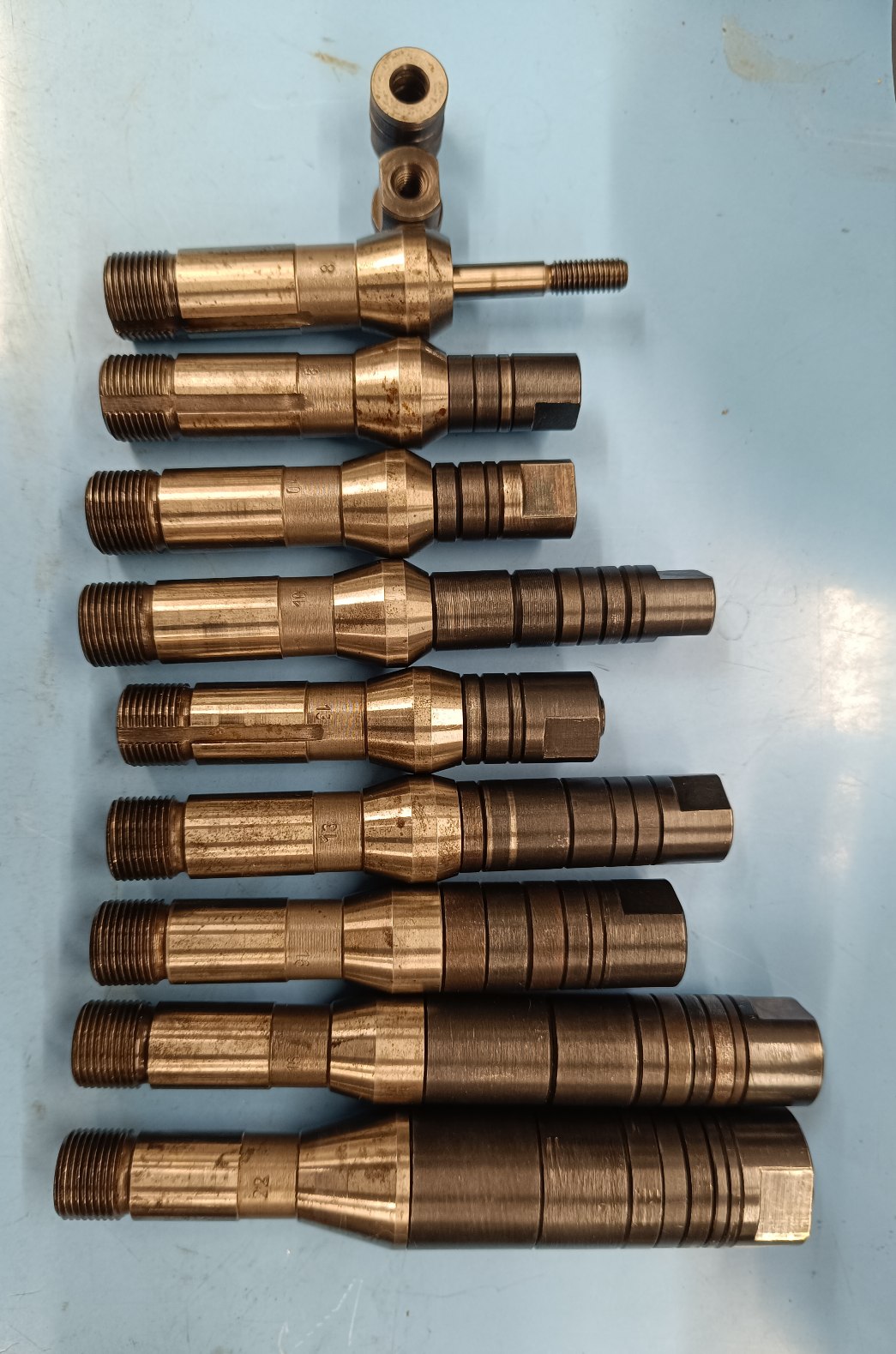 Pristála u mňa pekná sada upínacích tŕnikov. Upnutie do stroja e na tvar klieštiny so 6avitom M20x1.5, drieky na upnutie nástroja majú rozmery 8, 10, 13, 16 a 22 mm. Tŕne sú v pároch, s každého priemeru jeden krátky a jeden dlhší. Sú pekne opracované. Netušíte k akému stroju patria? Tipol by som možno nejakú malú odvalovku?