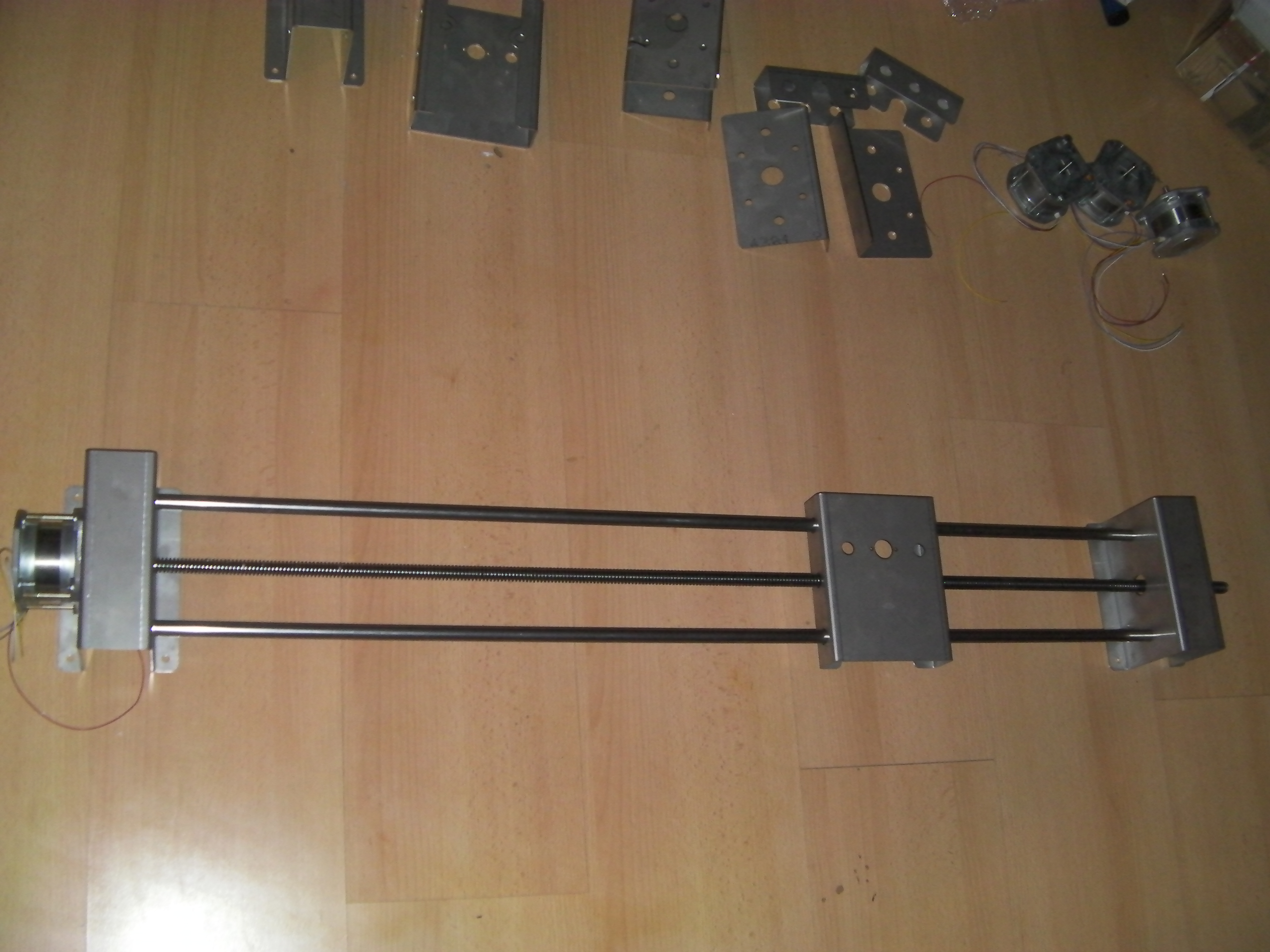 Konstrukce je vzor Maczak.Celý to jezdí na obyč. hlazenkách z Ferony (12mm).Rozjezdy jsou na ose x 1000mm a na ose y 310mm.Elektroniku jsem si postavil MM2001+motory MezNáchod (asi 0,6Nm).