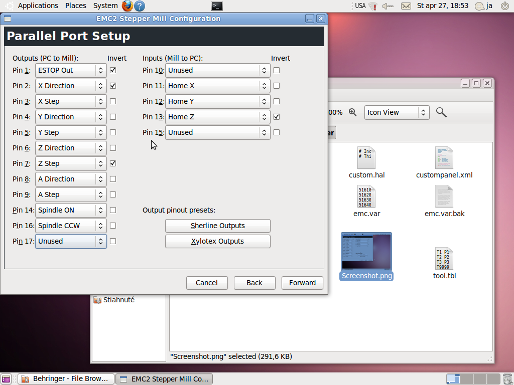 Nedarí sa mi zapnúť pwm na pine 17 ,stále vykazuje konf. chybu. Všetko ostatne mám definované bez využitia okrem 11,12,13 kde mám home a 14 kde mám spindle ON . Pri štarte PC sa mi spúšta vreteno až kým nespustím EMC. Na ktory pin mam zapnuť PWM?