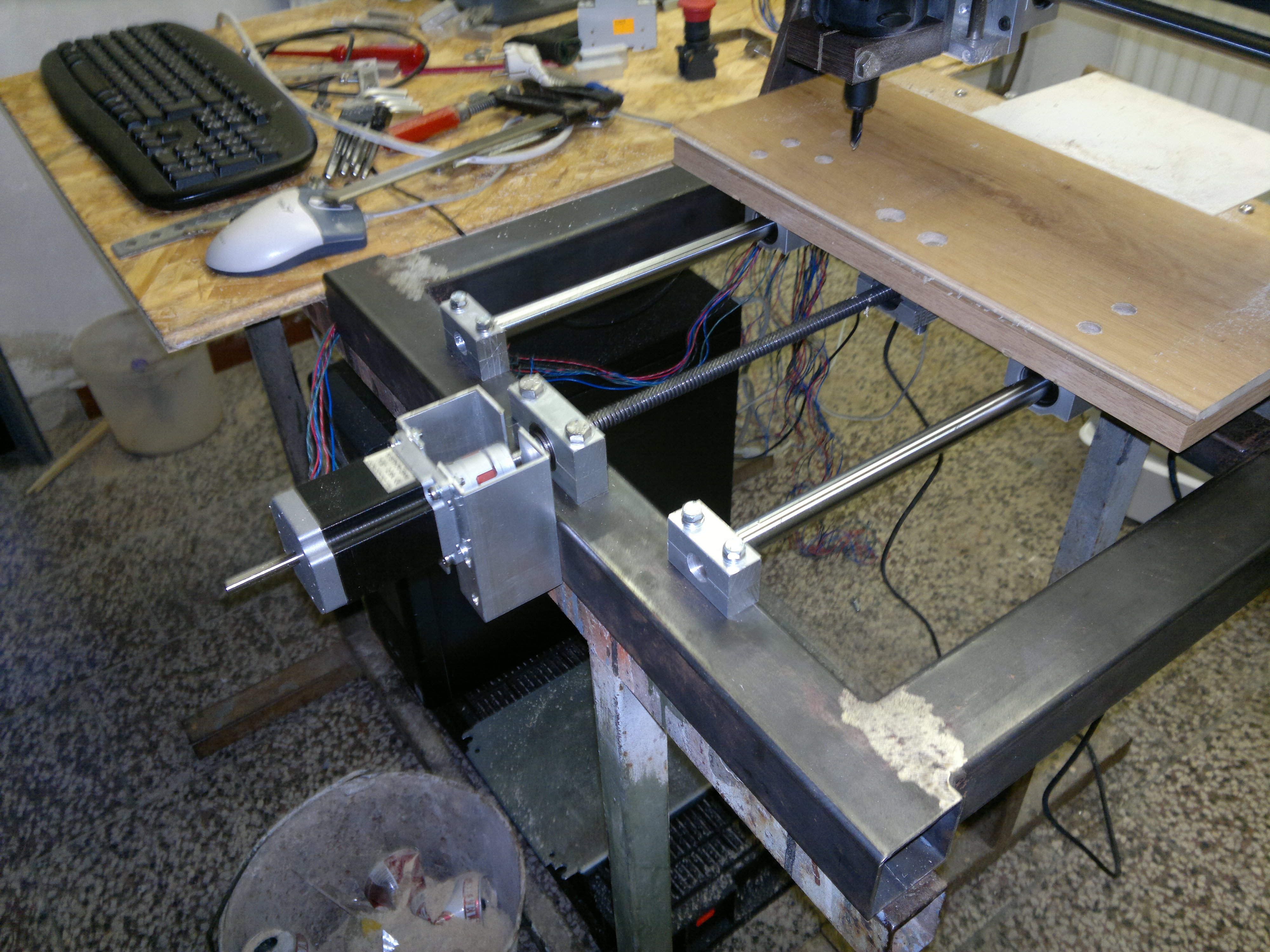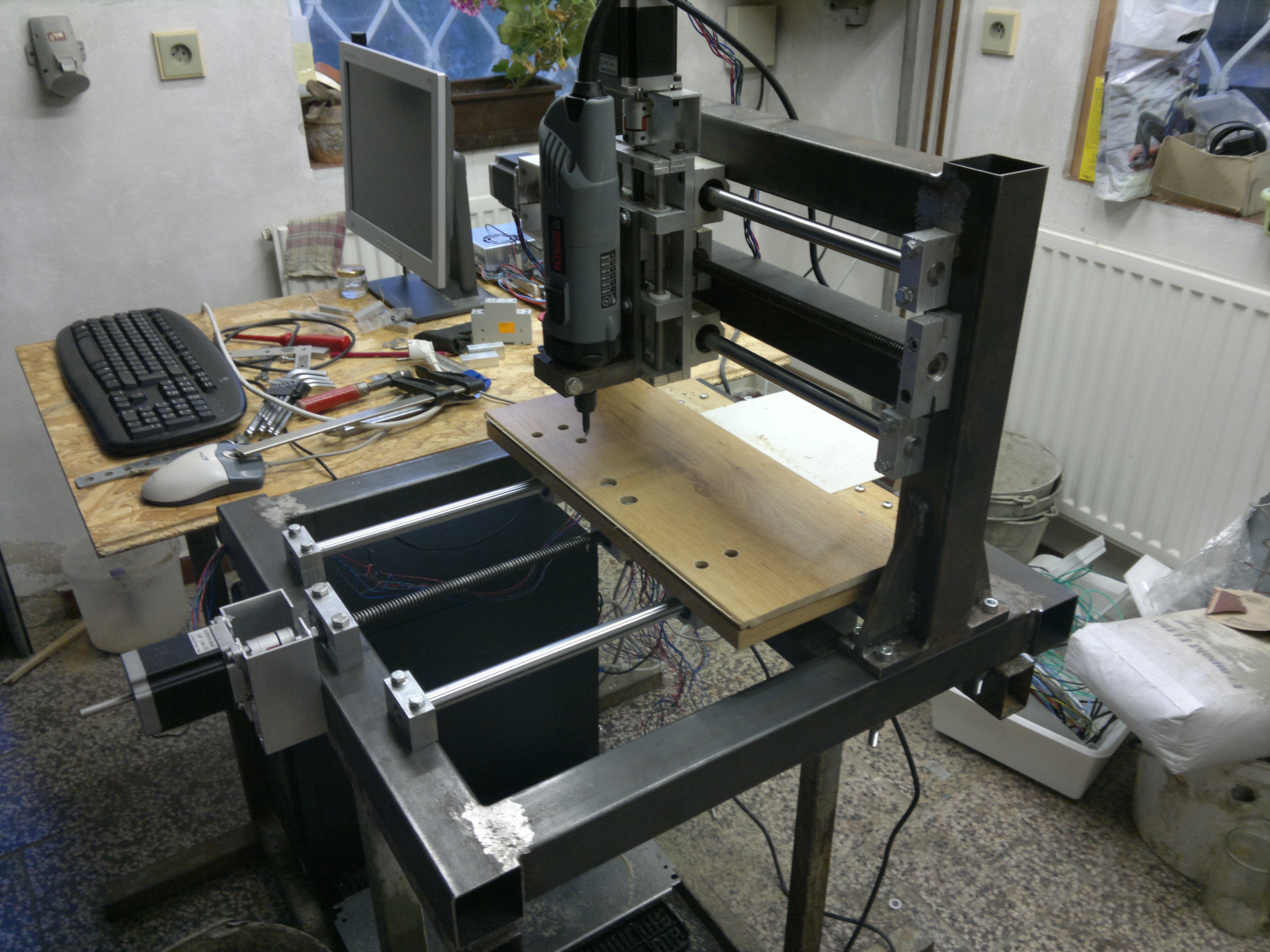 Nosná konstrukce je sešroubovoná ze dvou dílů svařených z jeklů 50 x 50mm. Rozjezdy jsou cca 340x250x80mm. Osy X a Y jezdí po nepodepřených tyčích průměr 16mm, posun je realizován trapézovým šroubem, průměr 12mm. Nedoporučuju. Na straně motoru jsou u obou os dvě kosoúhlá ložiska proti sobě, na opačné straně je ložisko do kolečkových bruslí. Osa Z jezdí po tyčích z tiskárny průměr 12 v teflonových pouzdrech. Pohyb zajišťuje metrický šroub M12, který chodí v teflonové matce a je uložen ve dvou ložiscích z kolečkových bruslí. Motory jsou všechny stejné 1.9Nm z cnc shopu. Motory jsou spojeny se šroubovicí pružnou spojkou z téhož zdroje. Ovládám je driverem M542. Motory jsou napájeny spínaným zdrojem 27V/320W. Vřeteno KRESS FME 1050. S celým tím hýbe EMC2 pod Linuxem, zatím bez koncových spínačů. Přikládám pár fotek. Třeba taky někomu poslouží jako inspirace.