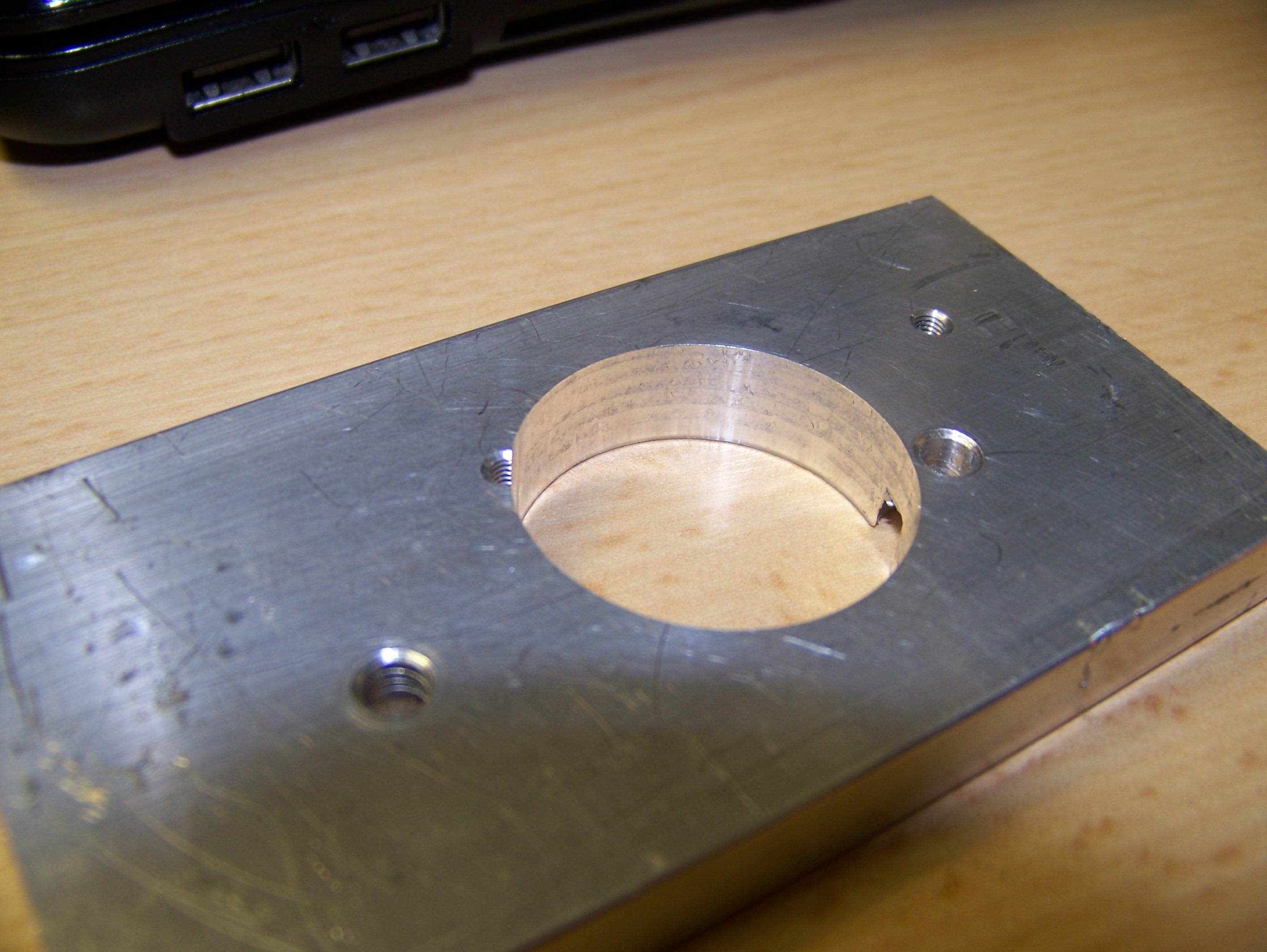protože s jídlem roste chuť, zkusil jsem hrábnout do hliníku. Výsledek předčil moje očekávání. Díra je krásně kulatá a podle dig. posuvky má i požadovaný průměr (30mm). Kdybych trochu zabral, tak do ní dostanu ložisko. Program jsem vygeneroval wizardem z Machu jako kruhovou kapsu. Musel jsem z něj jen smazat nějaký Gxx, co se EMCéčku nelíbil. Řezal jsem to dvoubřitou válcovou frézou průměr 8mm, F300, S29000, po 0,25mm. Pro zobořování do materiálu F50. Jen tak nasucho.