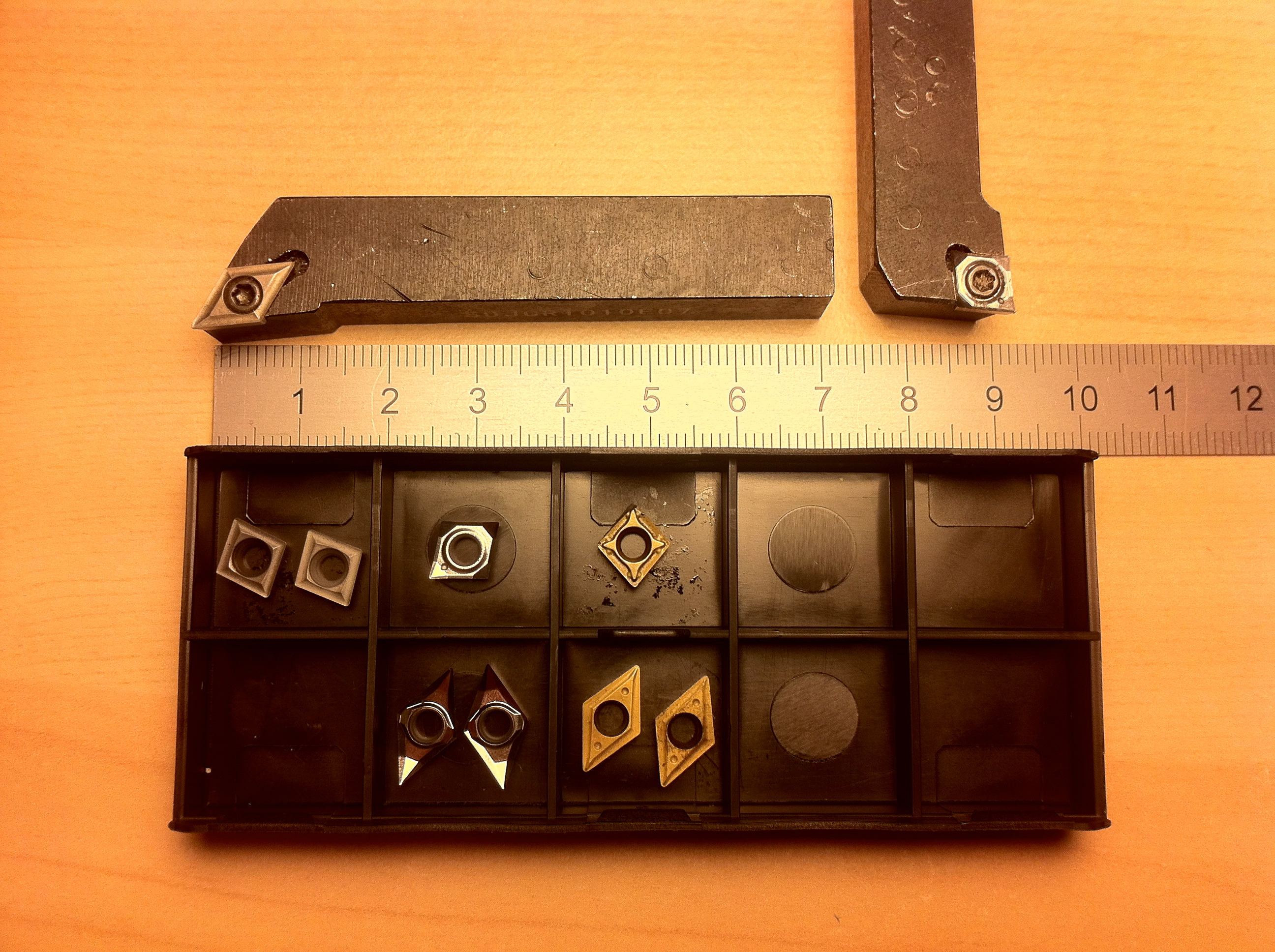 Většinou potřebuješ nějaké držáky na venkovní soustružení (pravý a levý), a něco do díry. Tvar, který ti bude nejvíc vyhovovat.