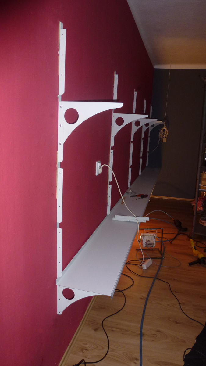 na ně jsou pak přichyceny police, též pomocí trhacích nýtů/stačí jeden na konci každé konzole